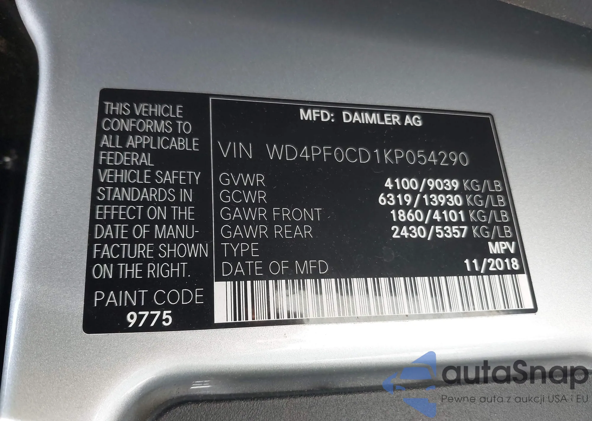 LOT: 42598985 VIN: WD4PF0CD1KP054290