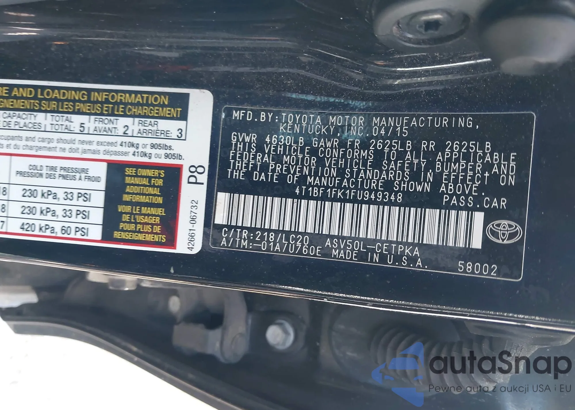 LOT: 42027764 VIN: 4T1BF1FK1FU949348