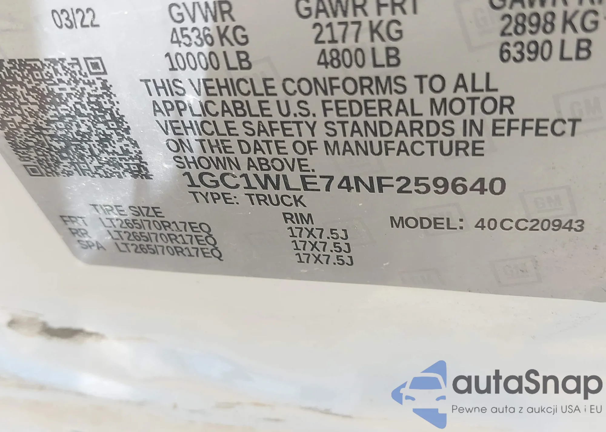 LOT: 41990674 VIN: 1GC1WLE74NF259640