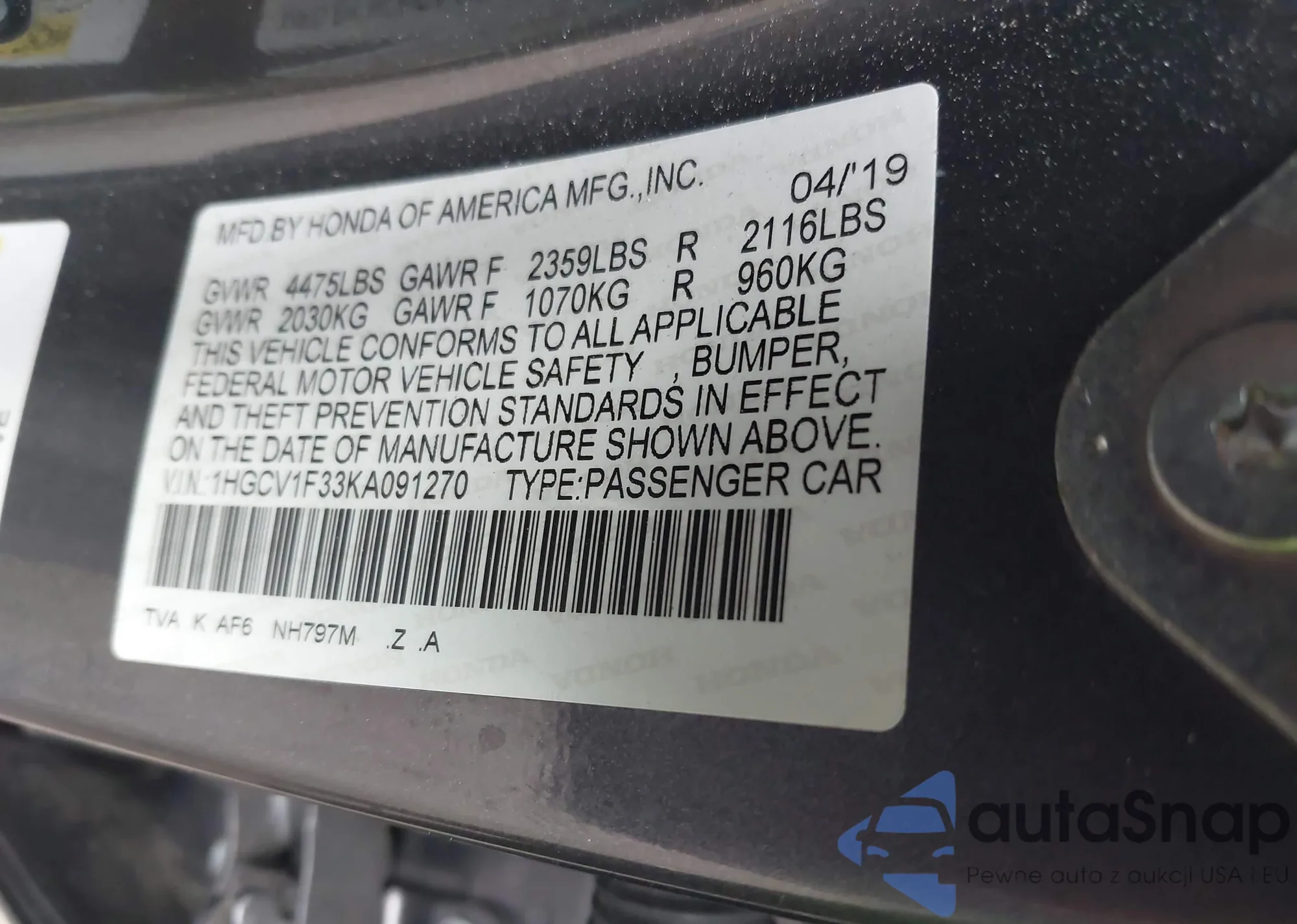 • VIN 1HGCV1F33KA091270