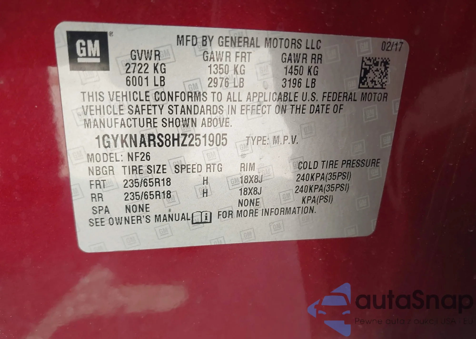 LOT: 42924039 VIN: 1GYKNARS8HZ251905