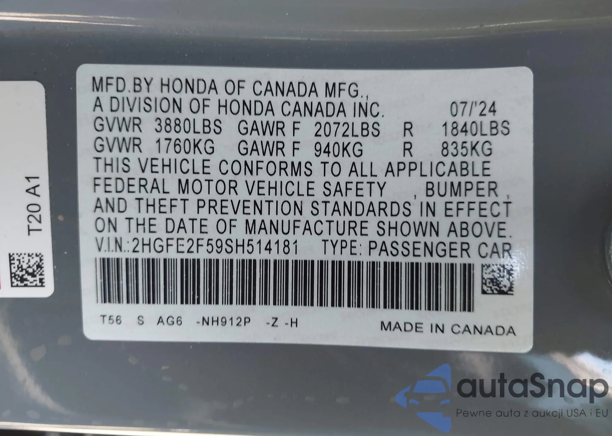 LOT: 42867325 VIN: 2HGFE2F59SH514181