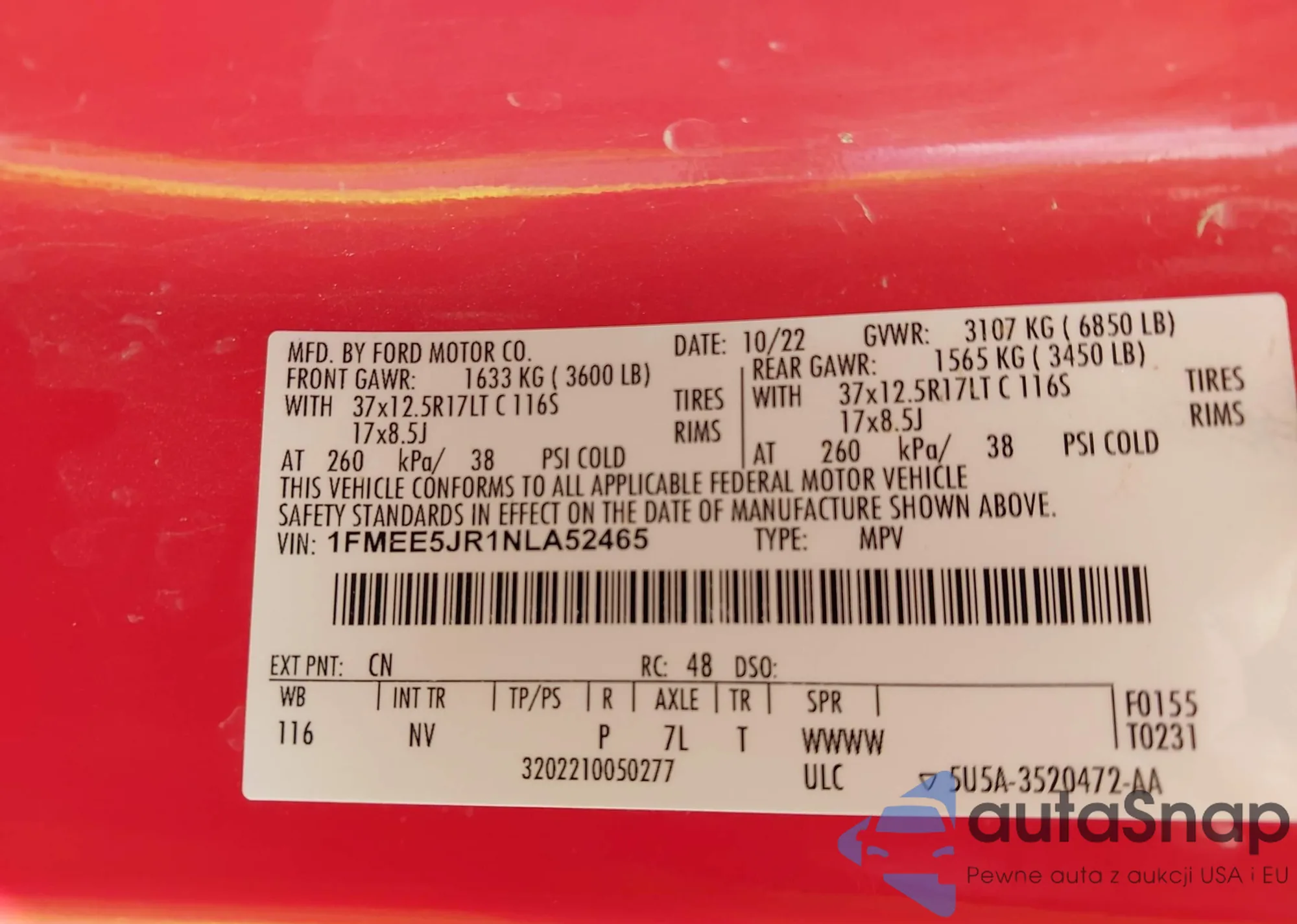 LOT: 42798448 VIN: 1FMEE5JR1NLA52465
