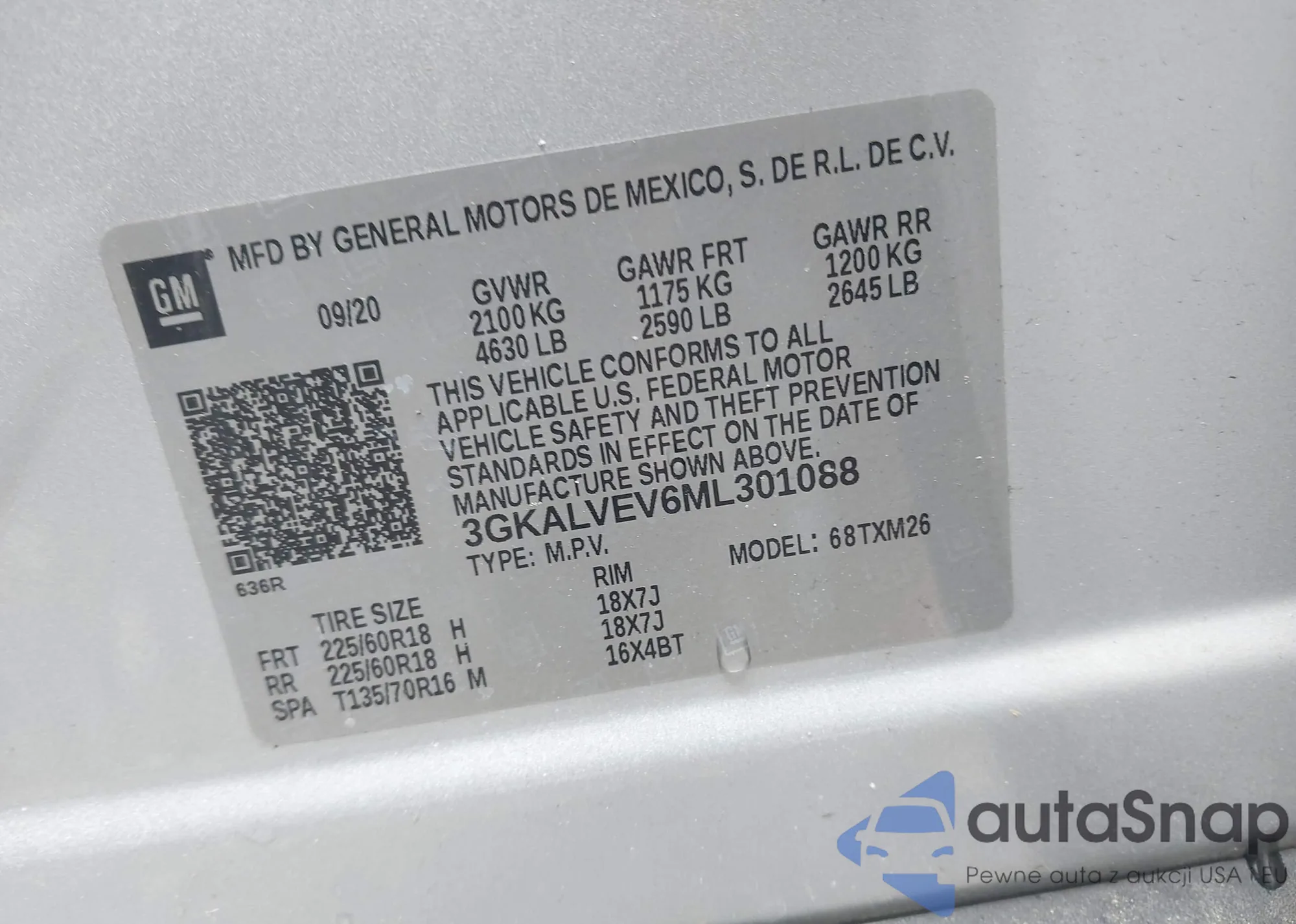 LOT: 42182701 VIN: 3GKALVEV6ML301088