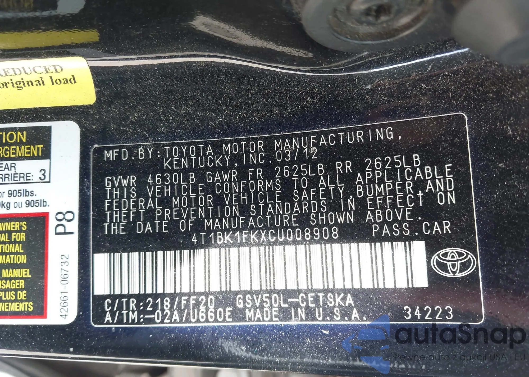 • VIN 4T1BK1FKXCU008908