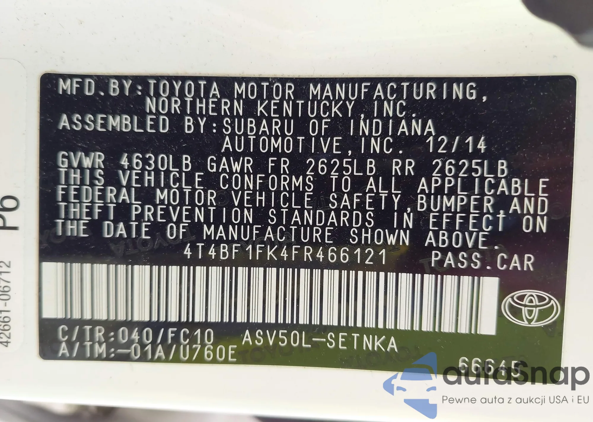 • VIN 4T4BF1FK4FR466121