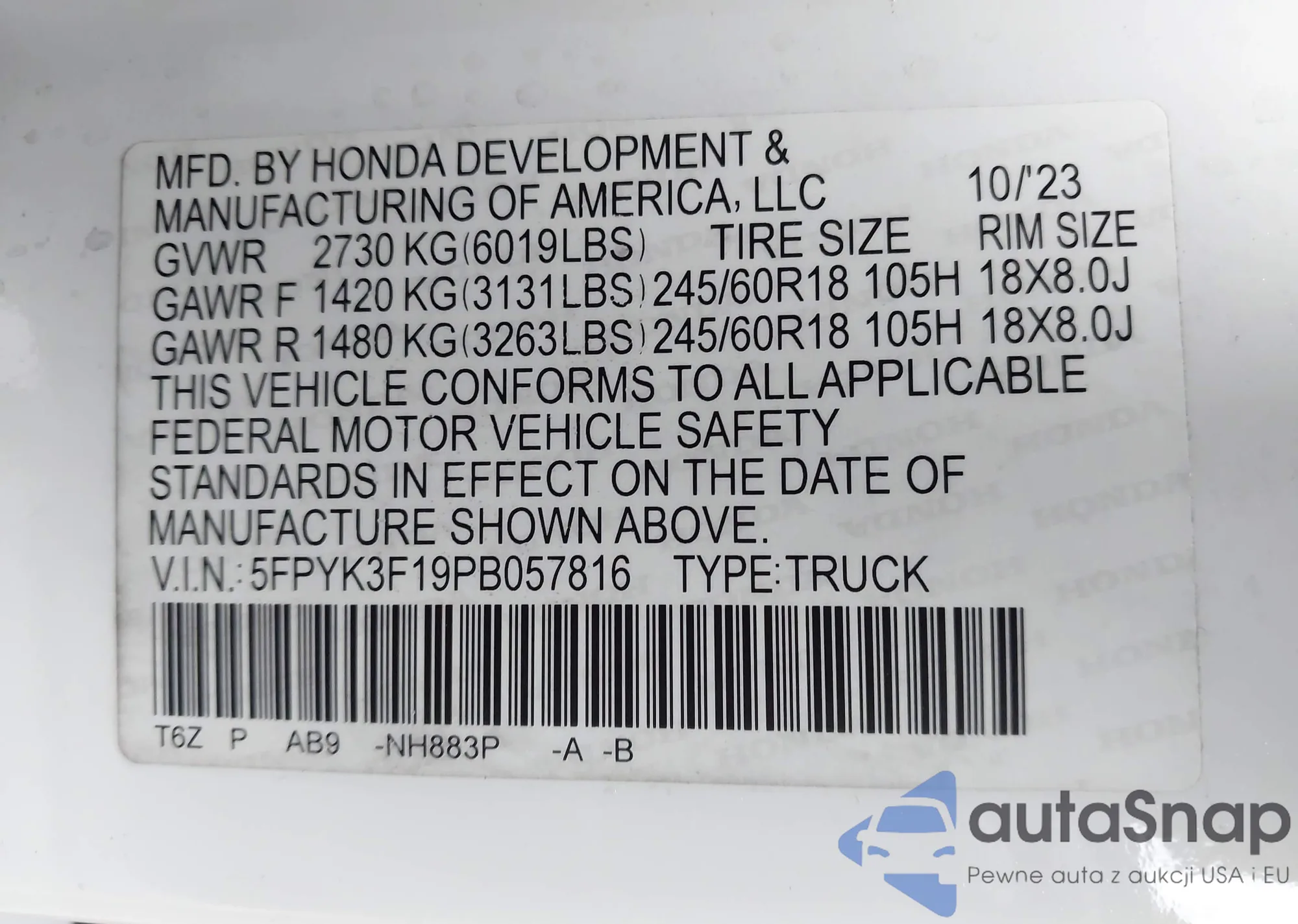 • VIN 5FPYK3F19PB057816