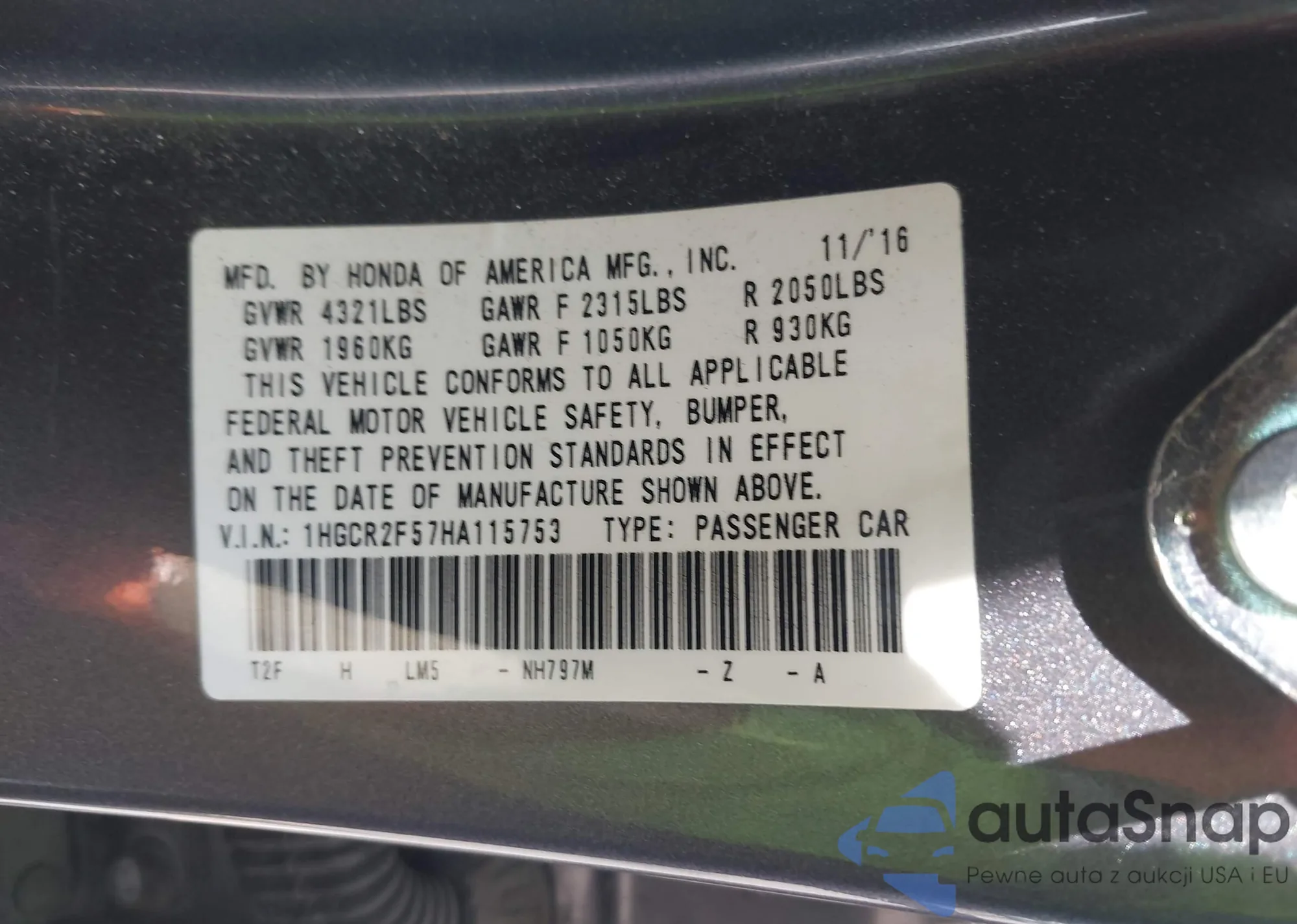 LOT: 42967116 VIN: 1HGCR2F57HA115753
