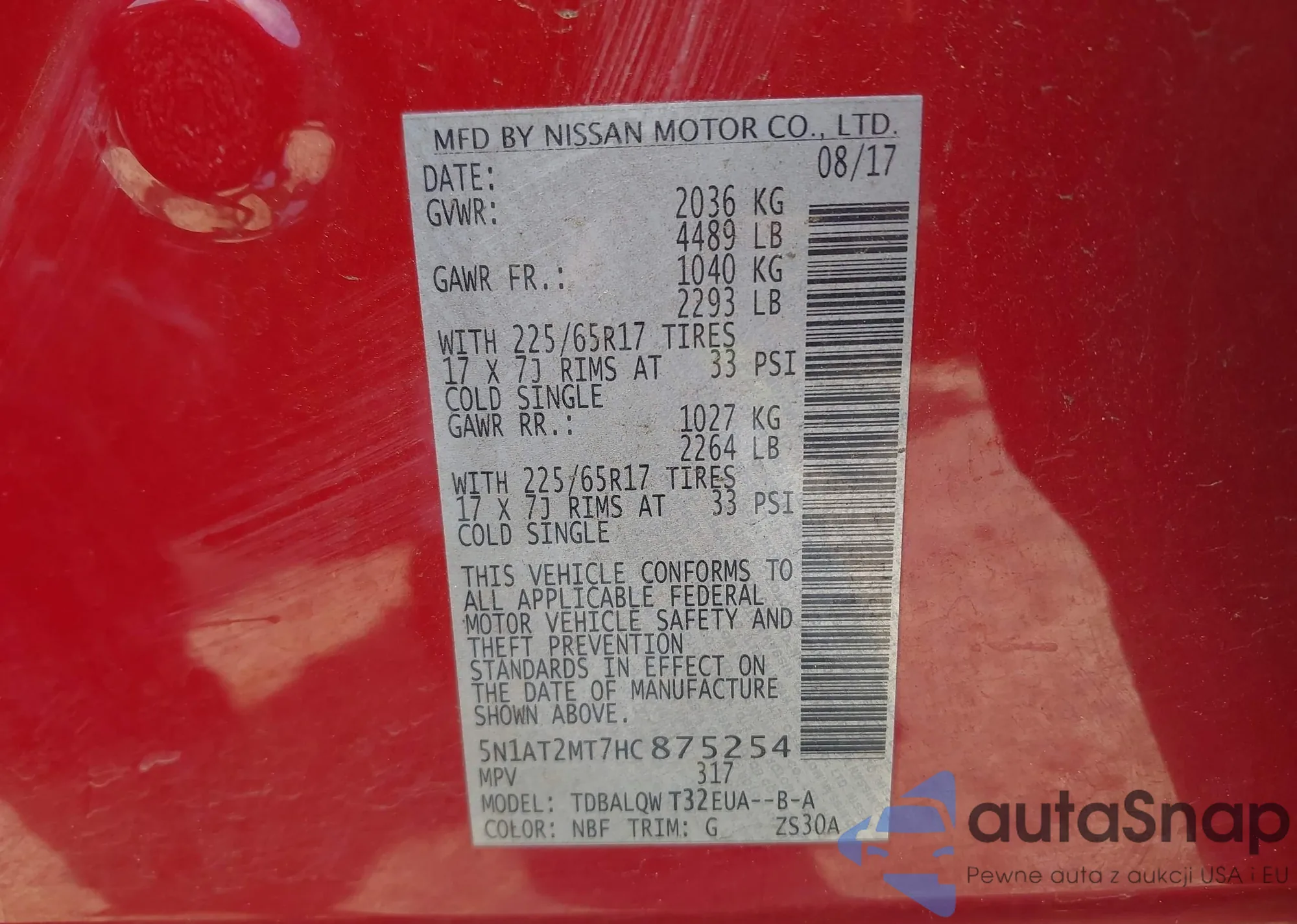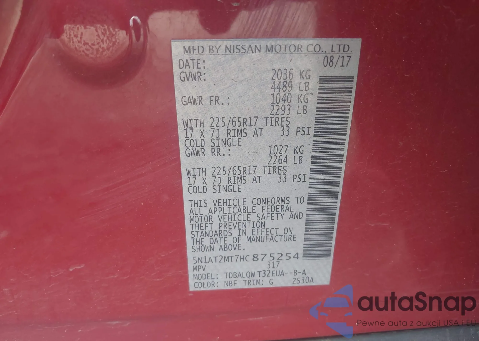 LOT: 42857164 VIN: 5N1AT2MT7HC875254