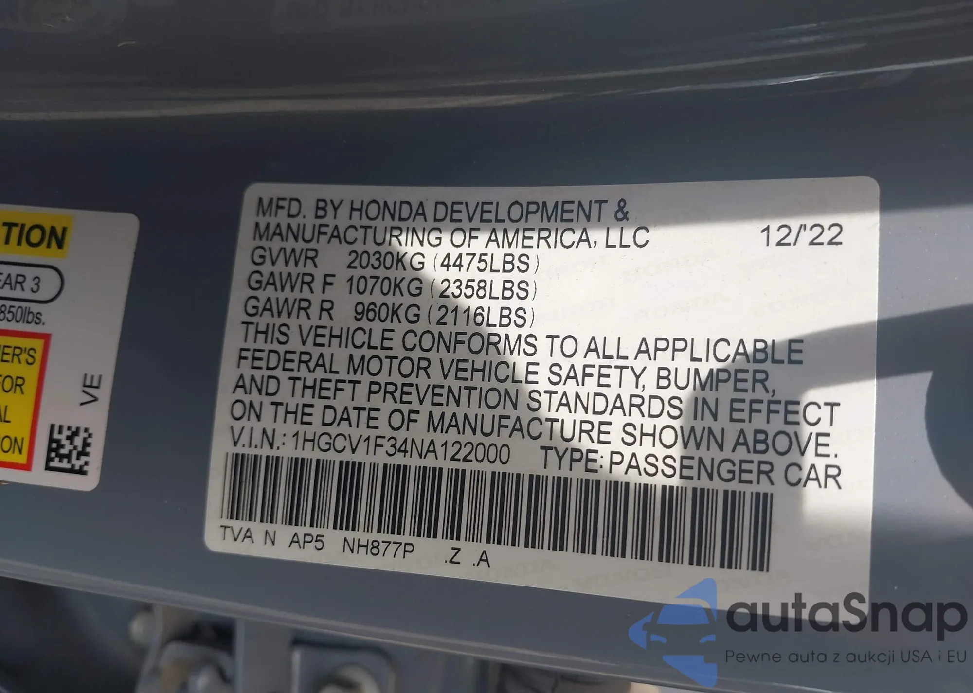 LOT: 42644977 VIN: 1HGCV1F34NA122000