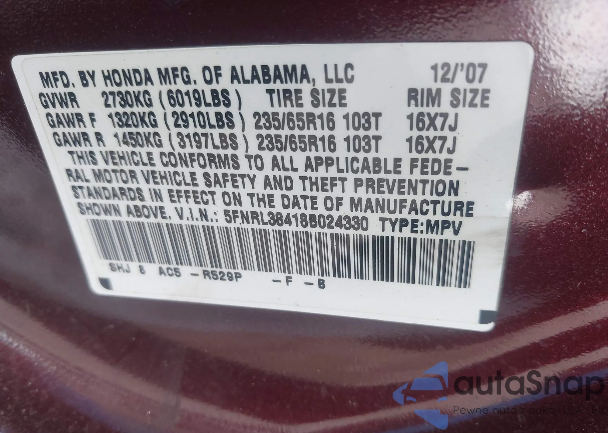 • VIN 1N4BL4BV7LC168825