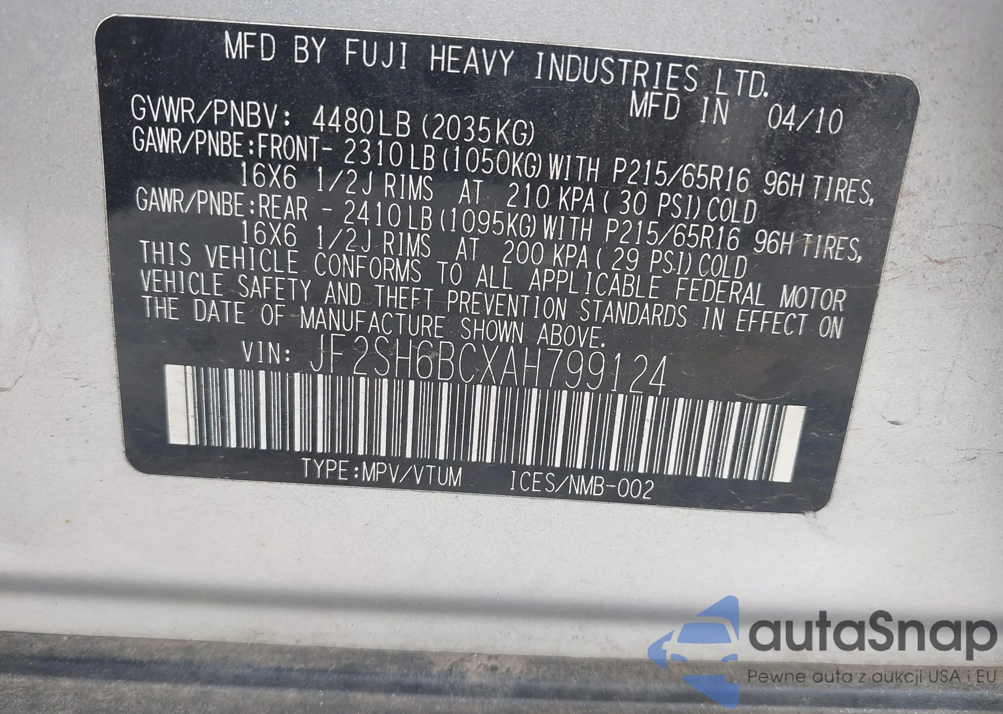 LOT: 42698114 VIN: JF2SH6BCXAH799124