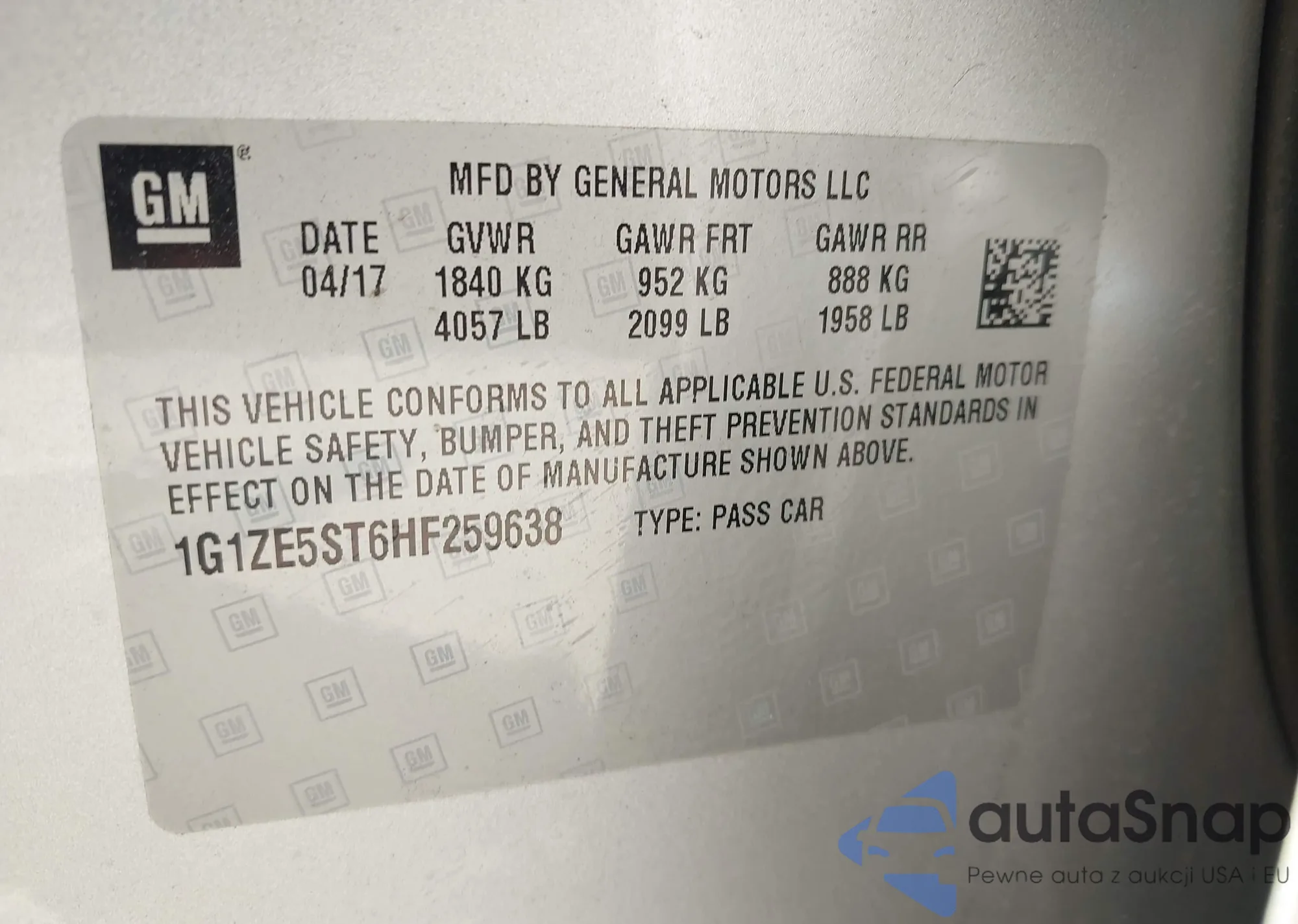 • VIN 1G1ZE5ST6HF259638