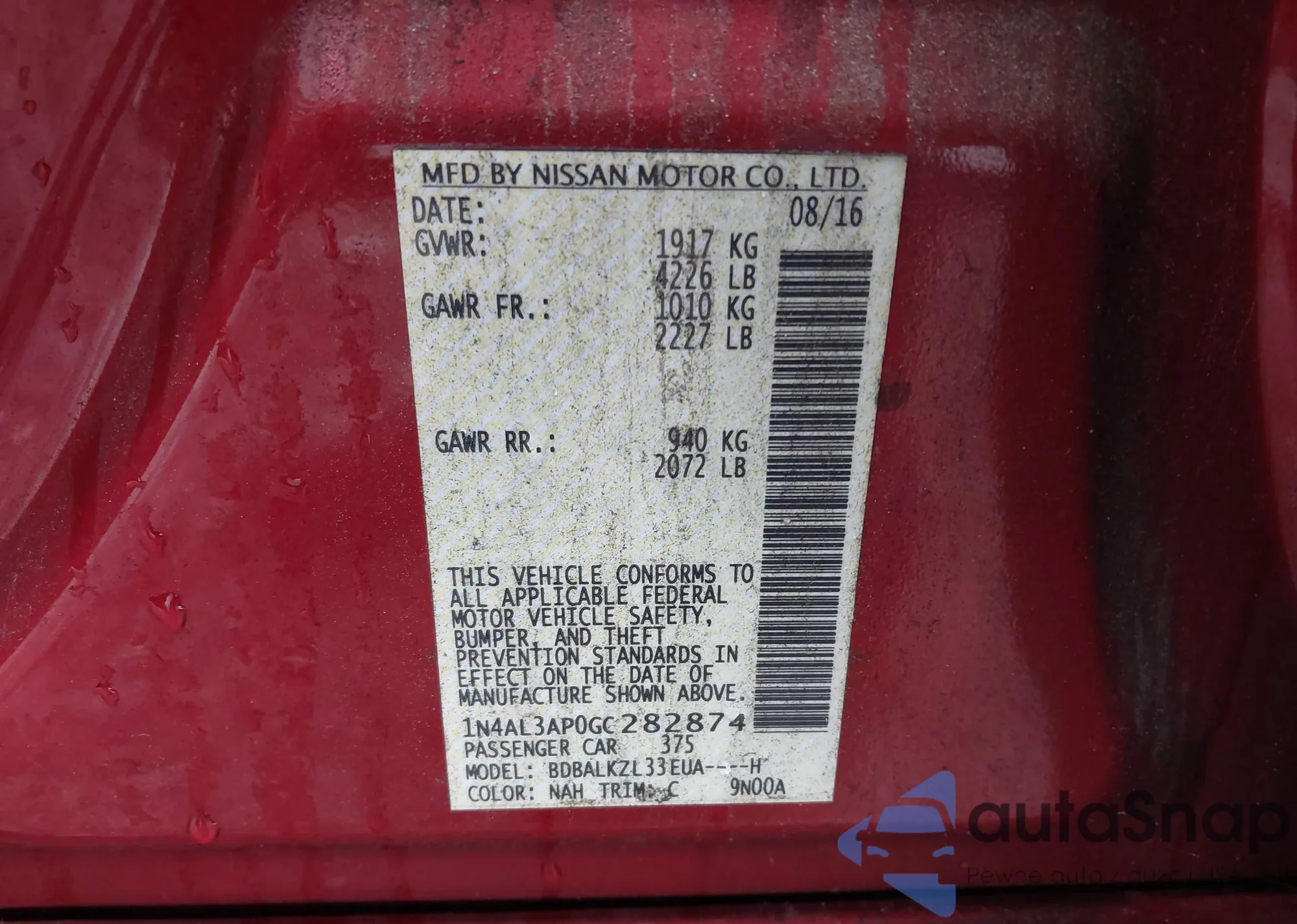 • VIN 1N4AL3AP0GC282874