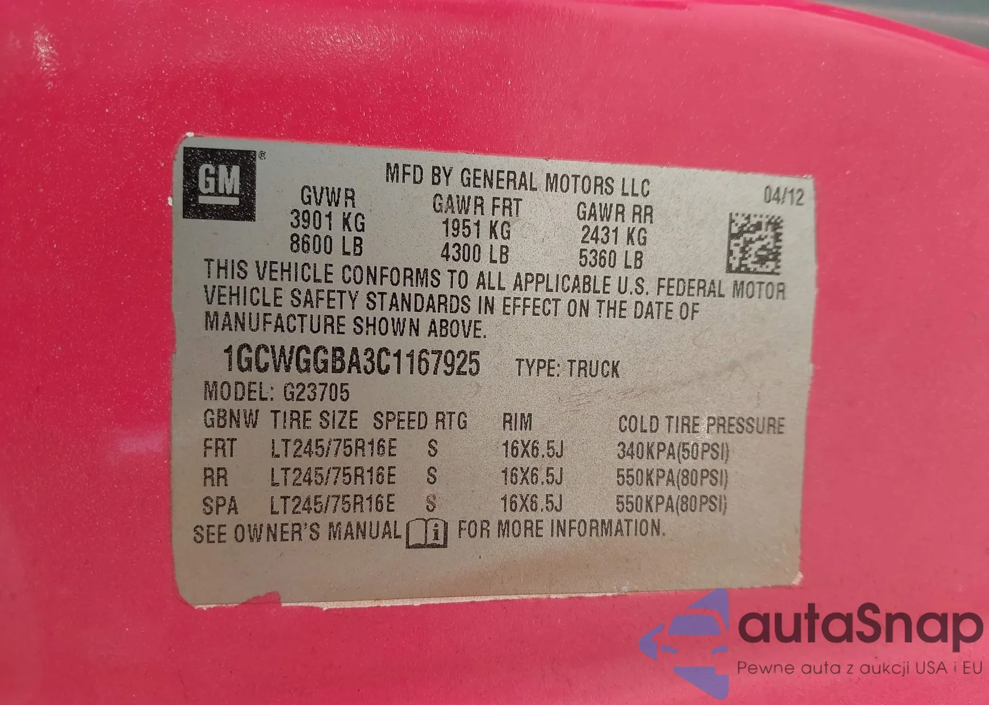 LOT: 42068275 VIN: 1GCWGGBA3C1167925