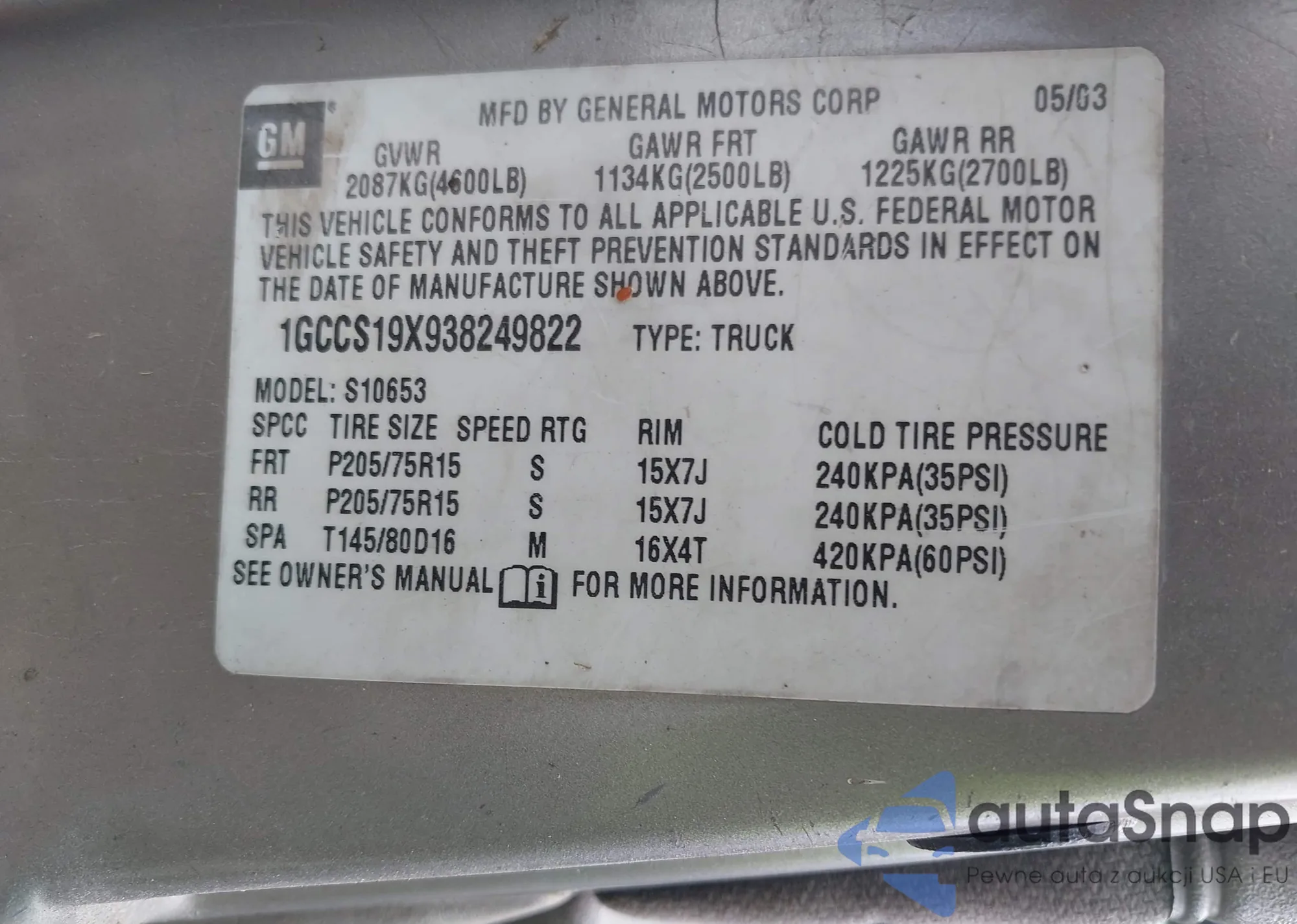 • VIN 1GCCS19X938249822
