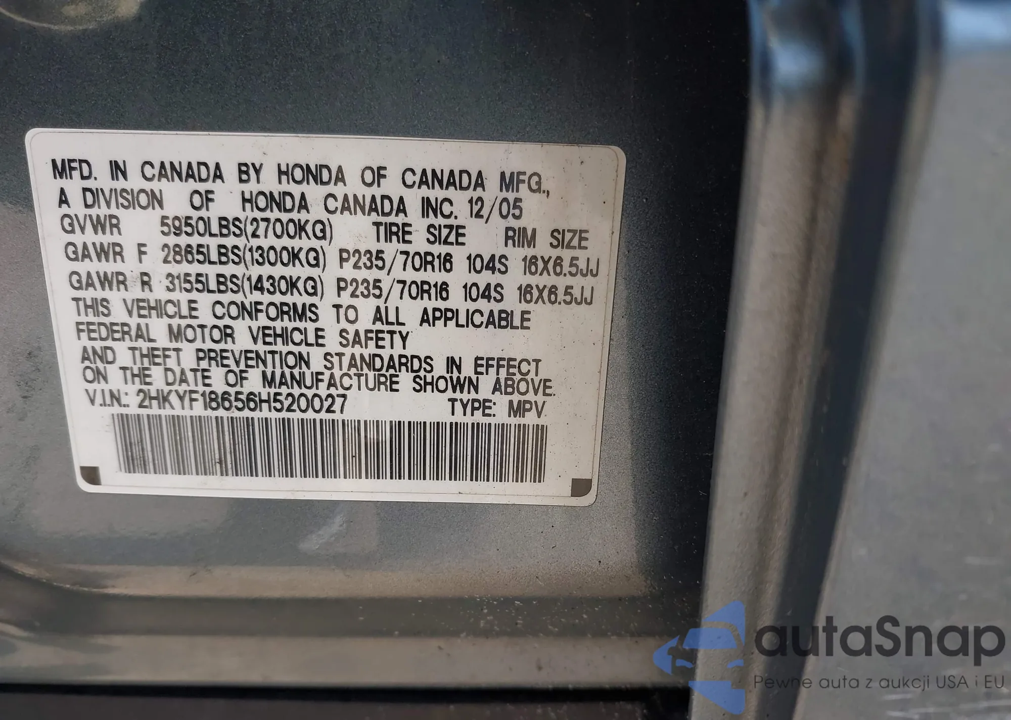 LOT: 43001943 VIN: 2HKYF18656H520027