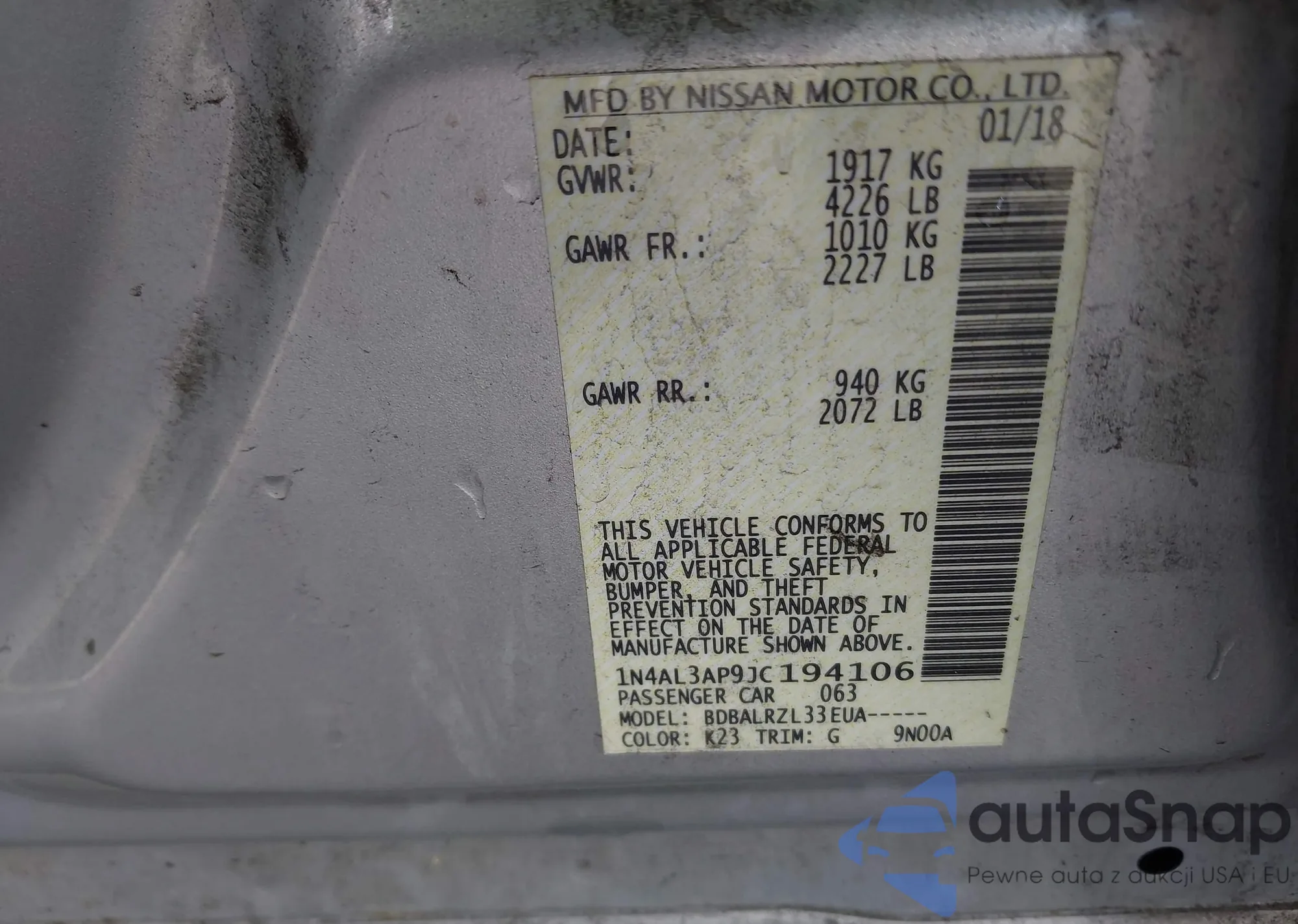 LOT: 41848876 VIN: 1N4AL3AP9JC194106
