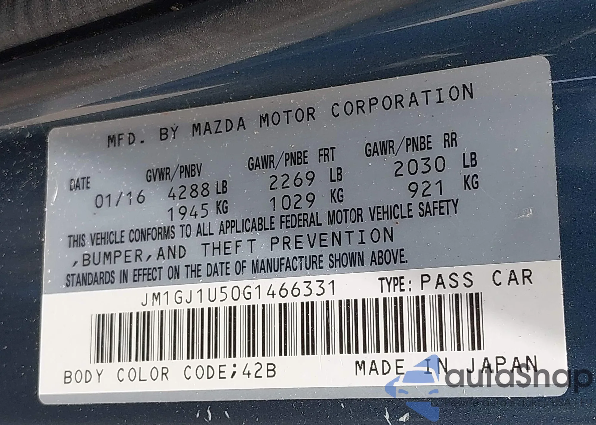 LOT: 42595321 VIN: JM1GJ1U50G1466331