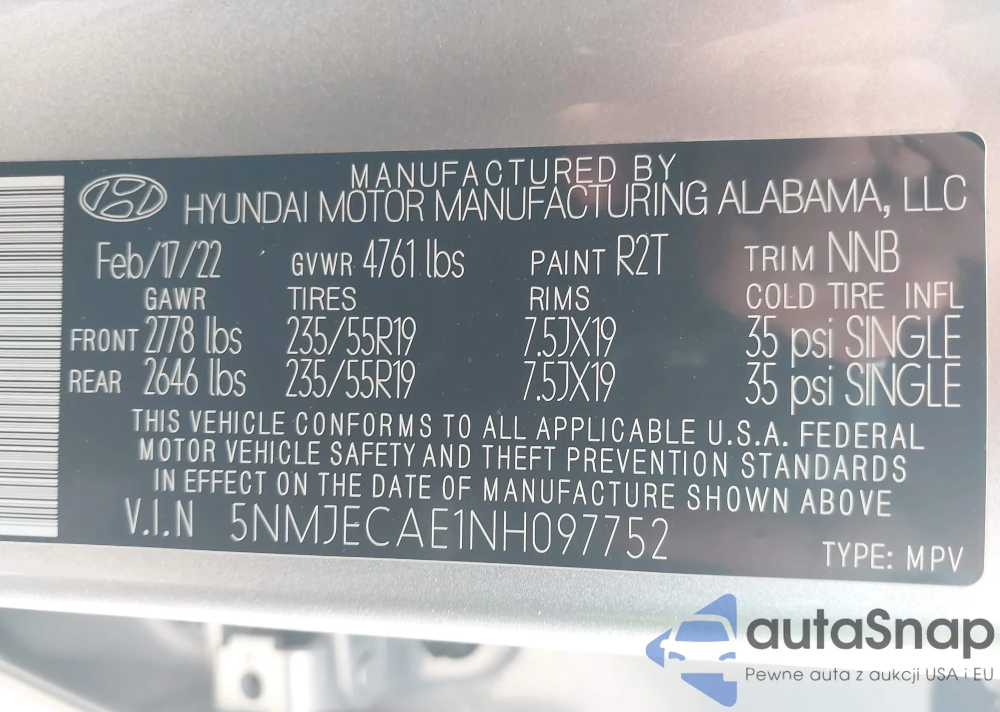 • VIN 5NMJECAE1NH097752