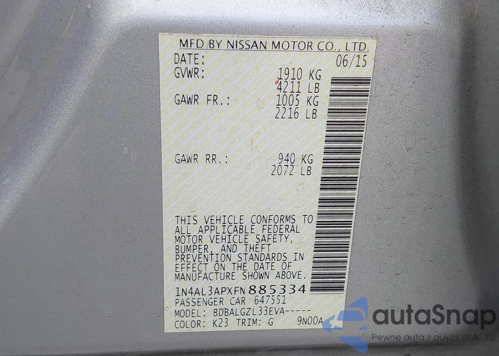 • VIN 1N4AL3APXFN885334