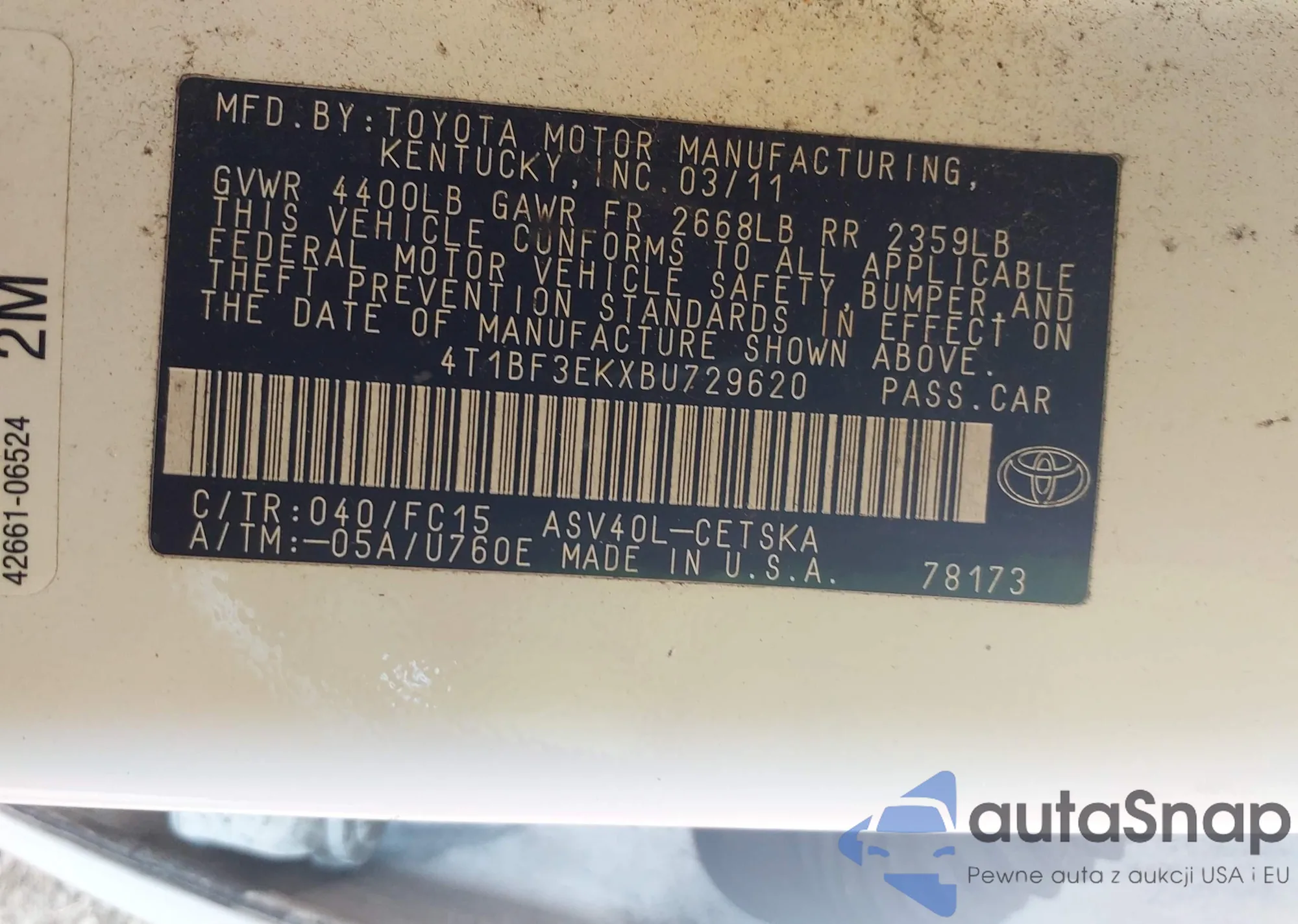 LOT: 42858091 VIN: 4T1BF3EKXBU729620