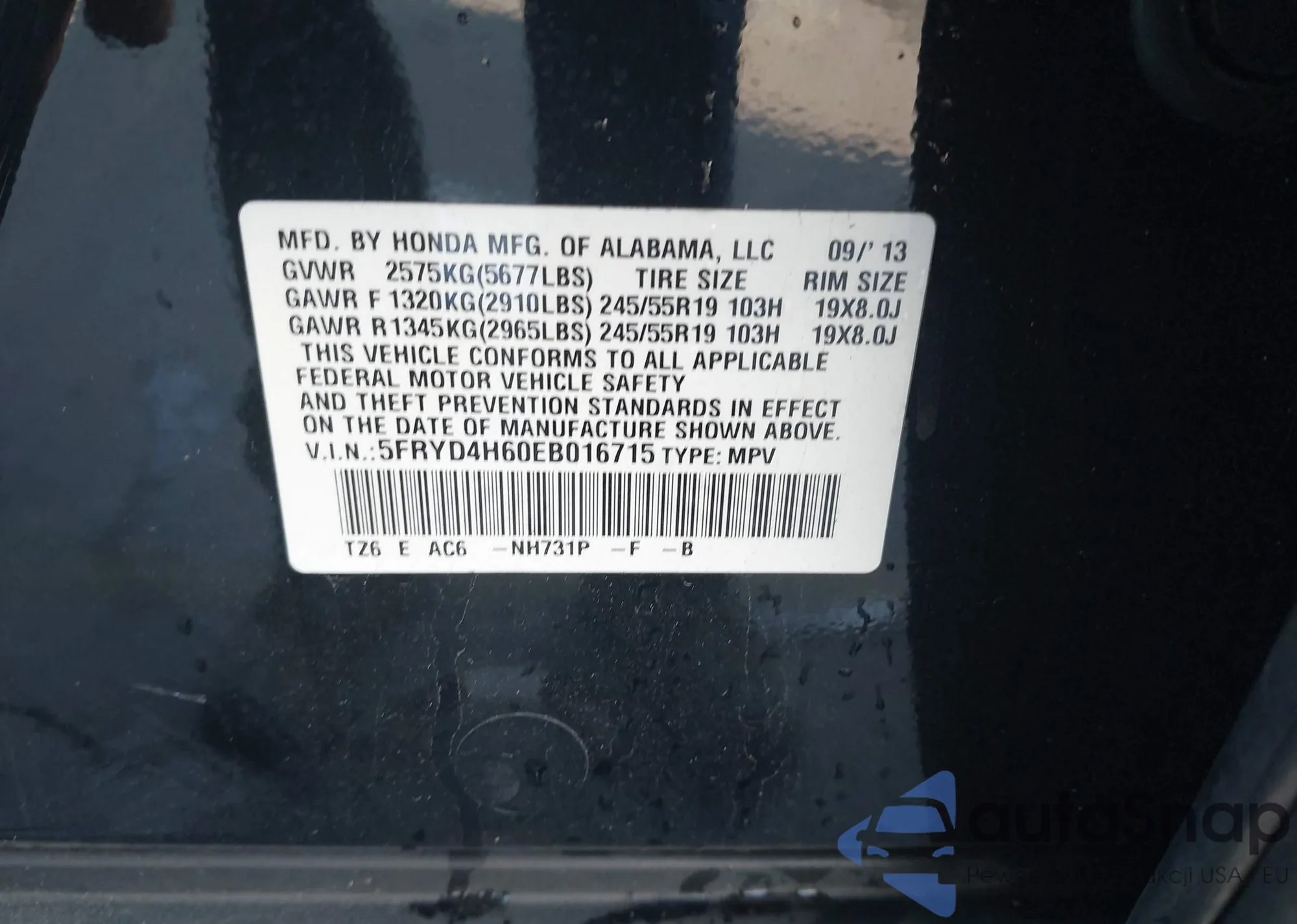 • VIN 5J6RW1H55KA024121