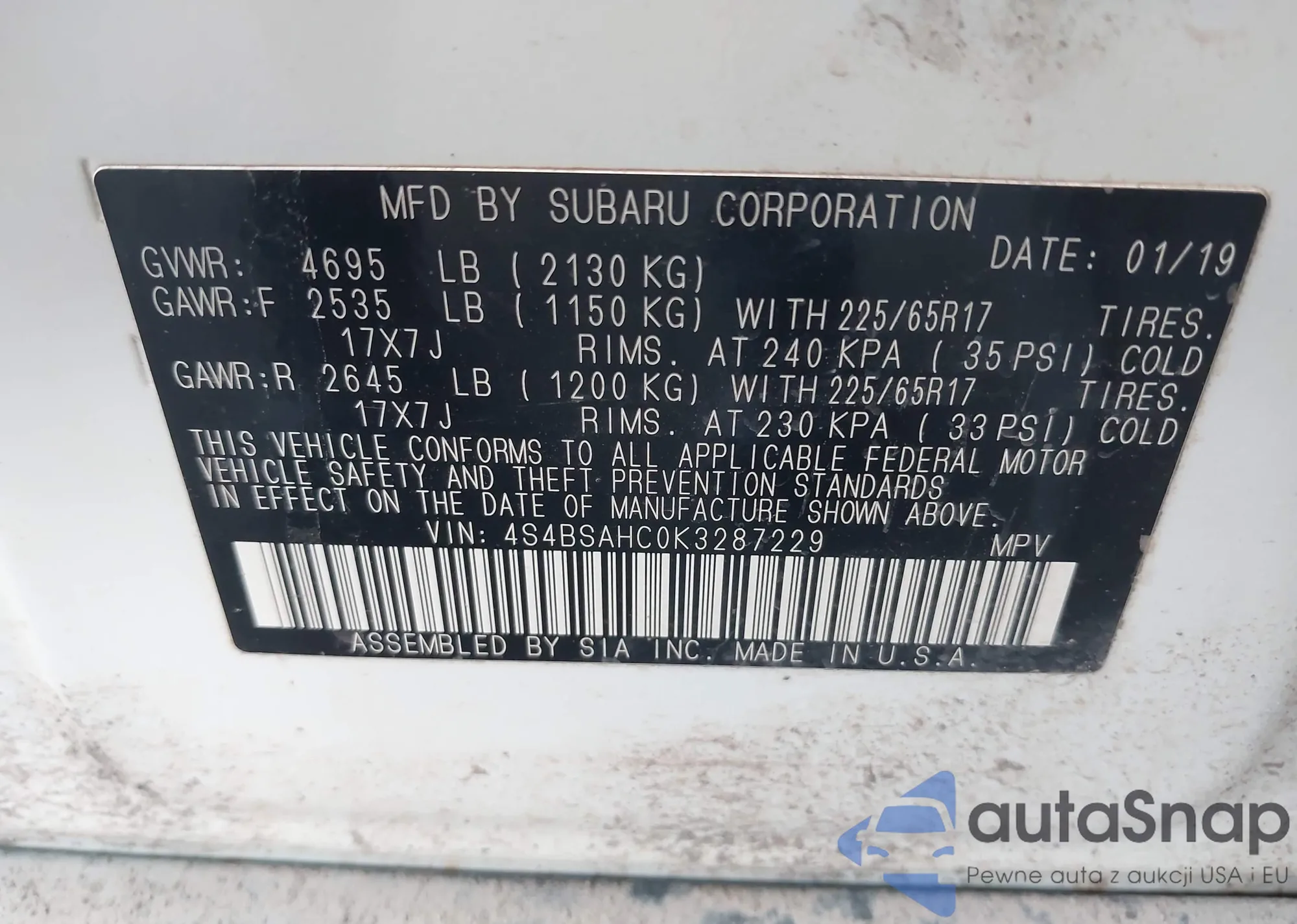 • VIN 4S4BSAHC0K3287229