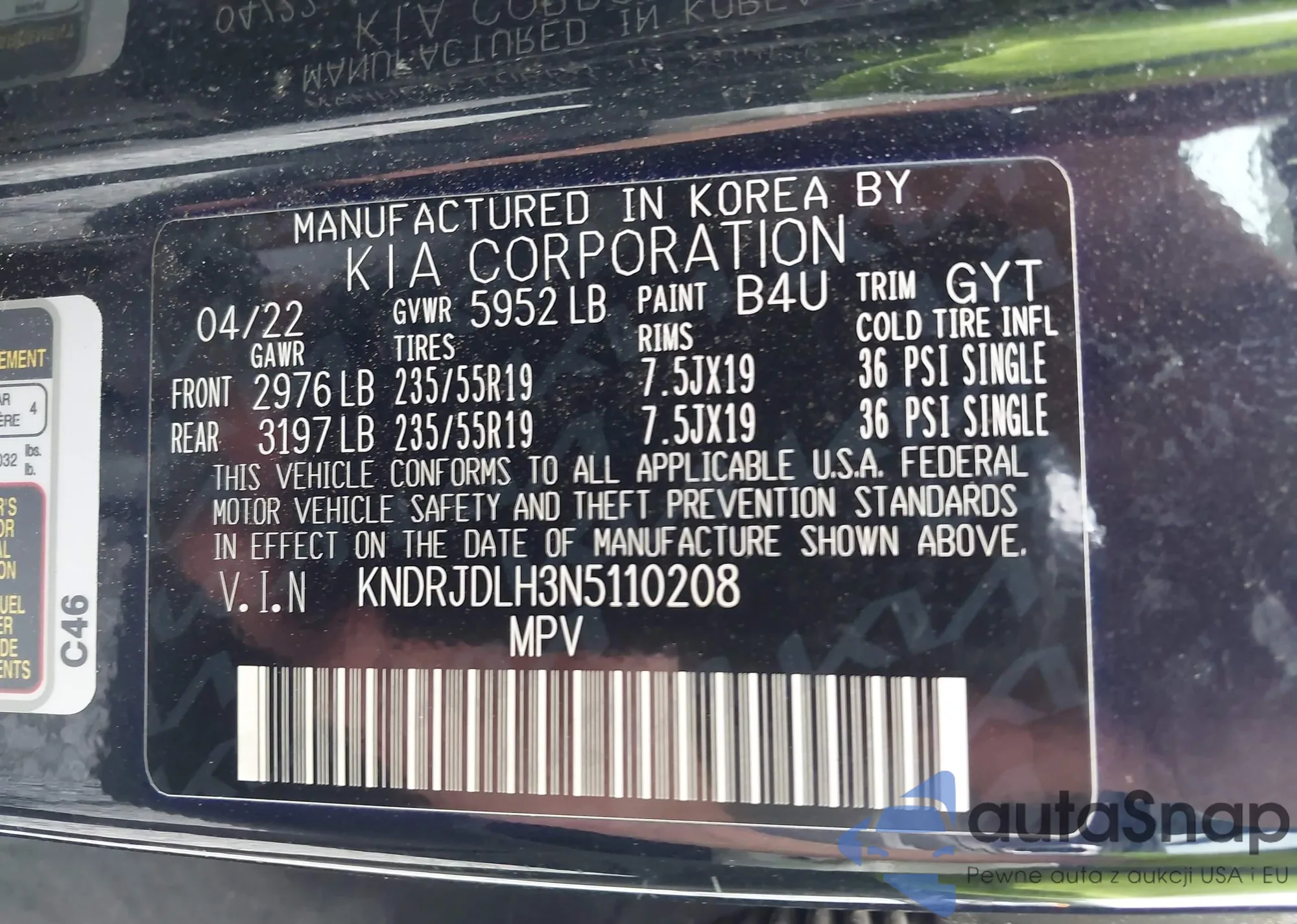 LOT: 42710966 VIN: KNDRJDLH3N5110208