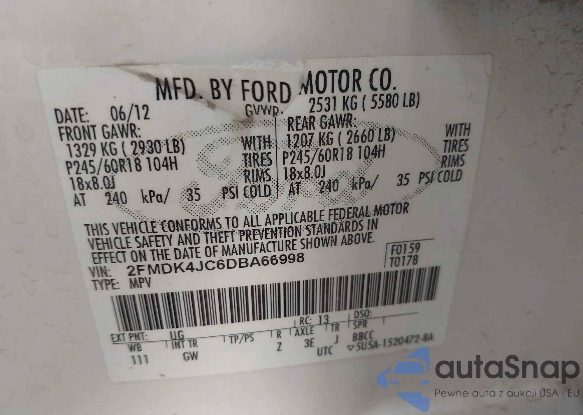LOT: 42836033 VIN: 2FMDK4JC6DBA66998