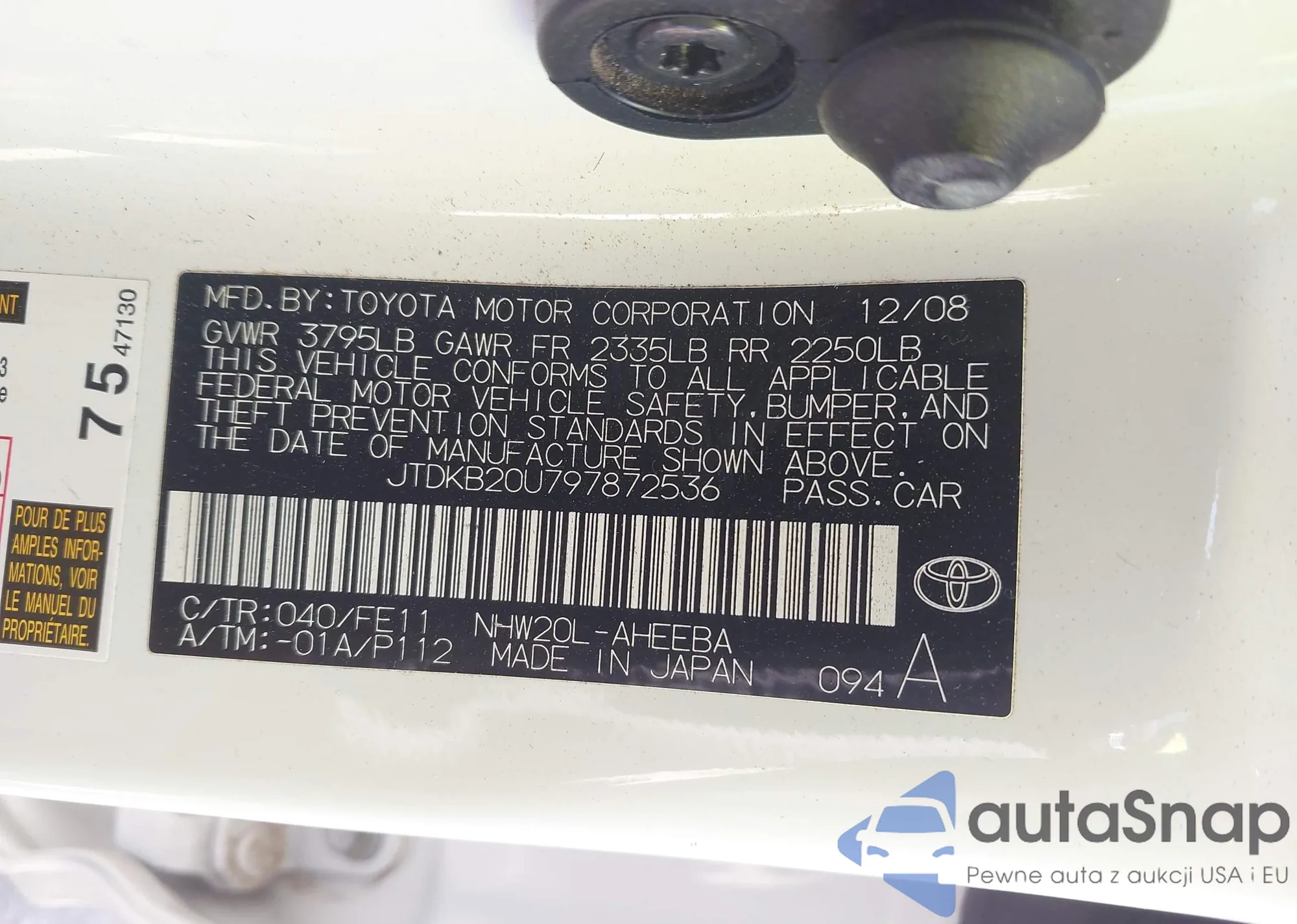 LOT: 42908584 VIN: JTDKB20U797872536