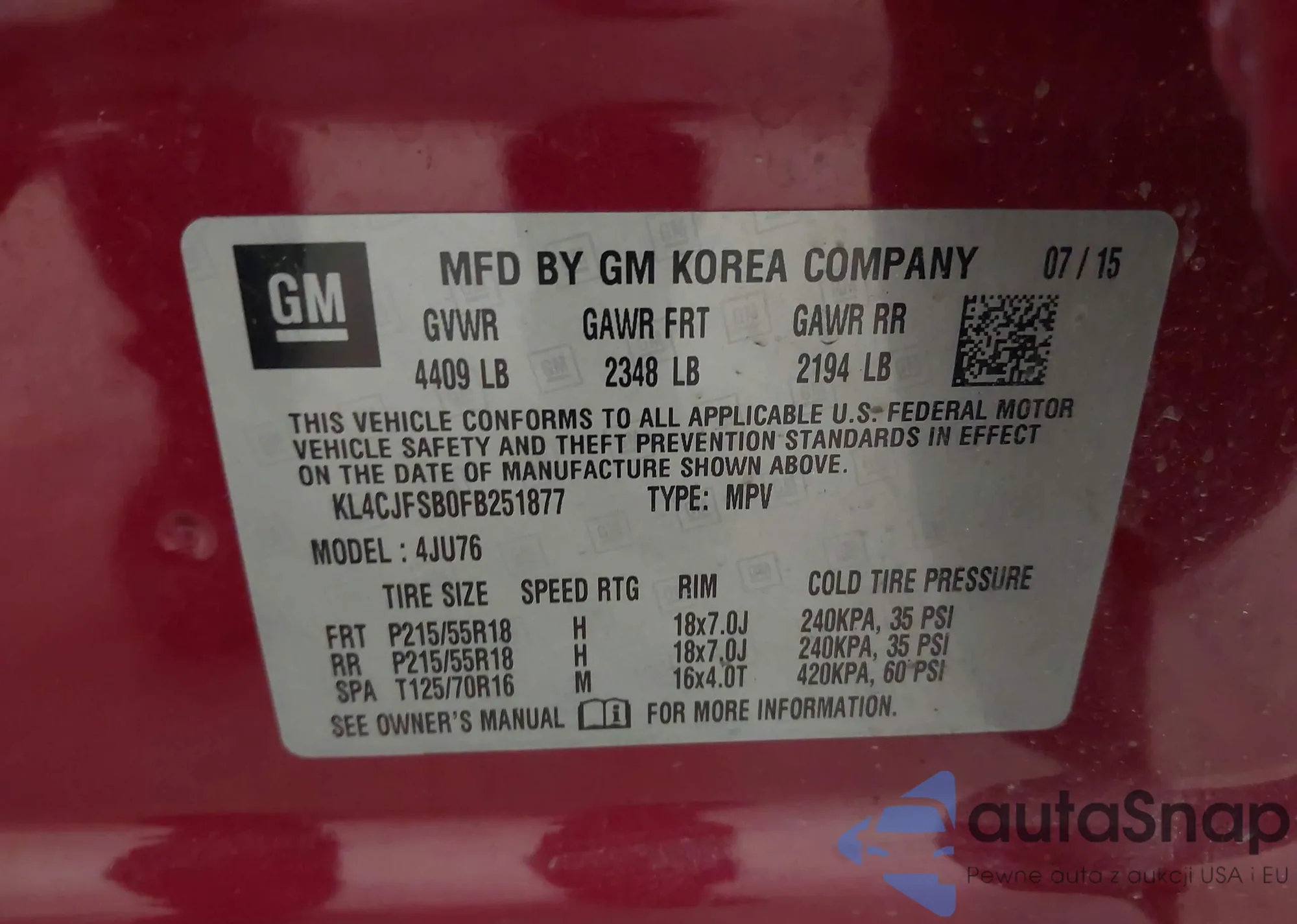 LOT: 42834338 VIN: JF2SJADC5FH511375