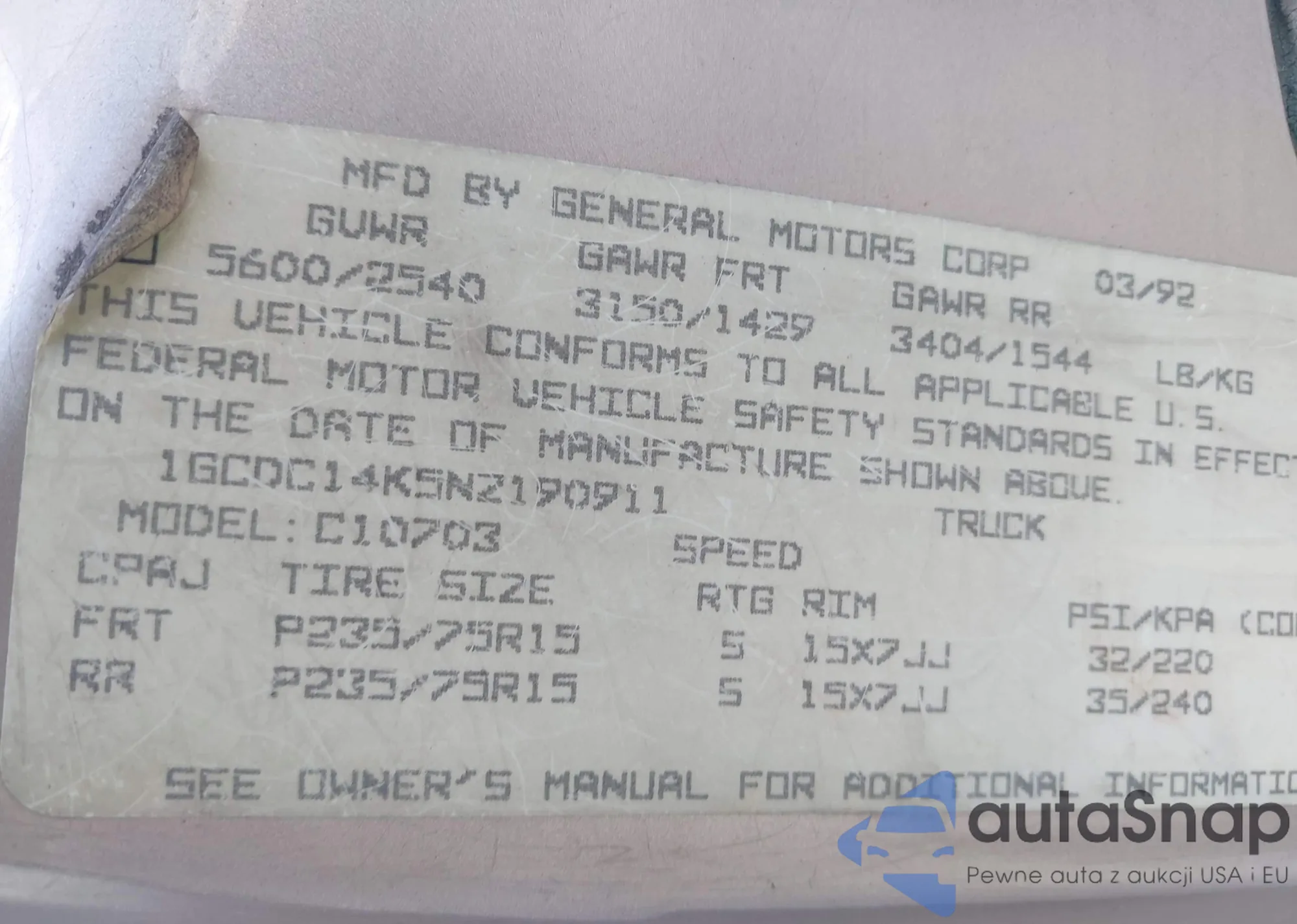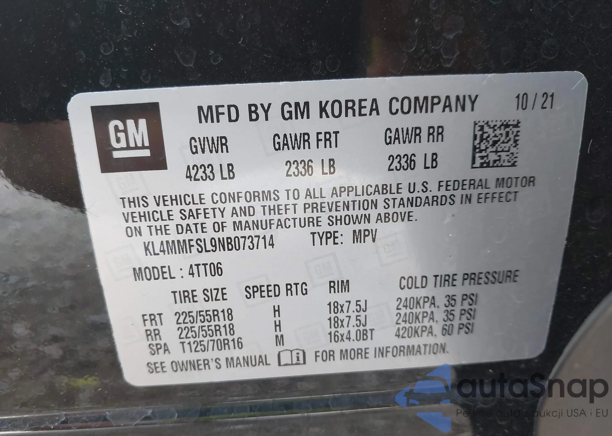 • VIN KL4MMFSL9NB073714