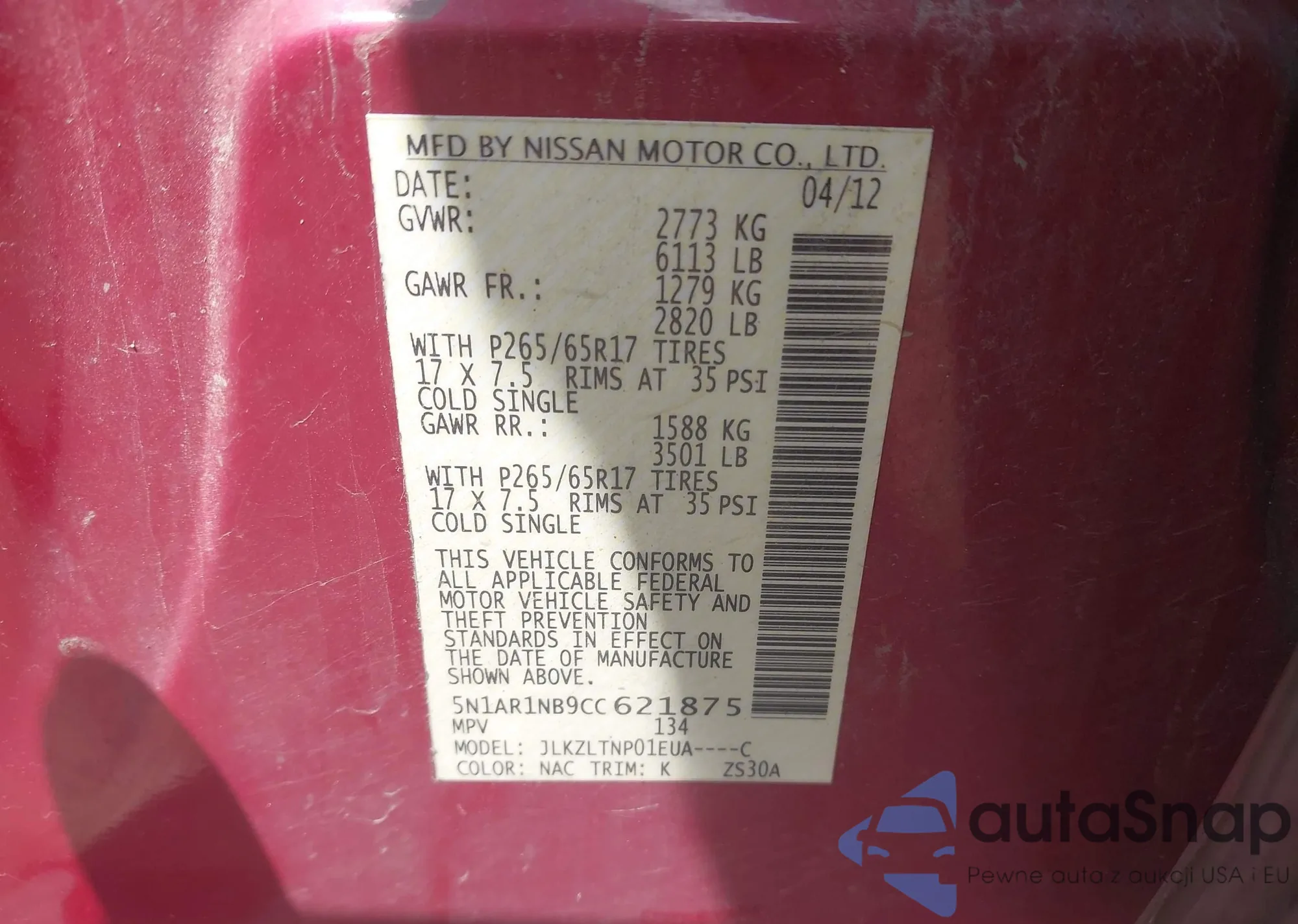 LOT: 42919654 VIN: 5N1AR1NB9CC621875