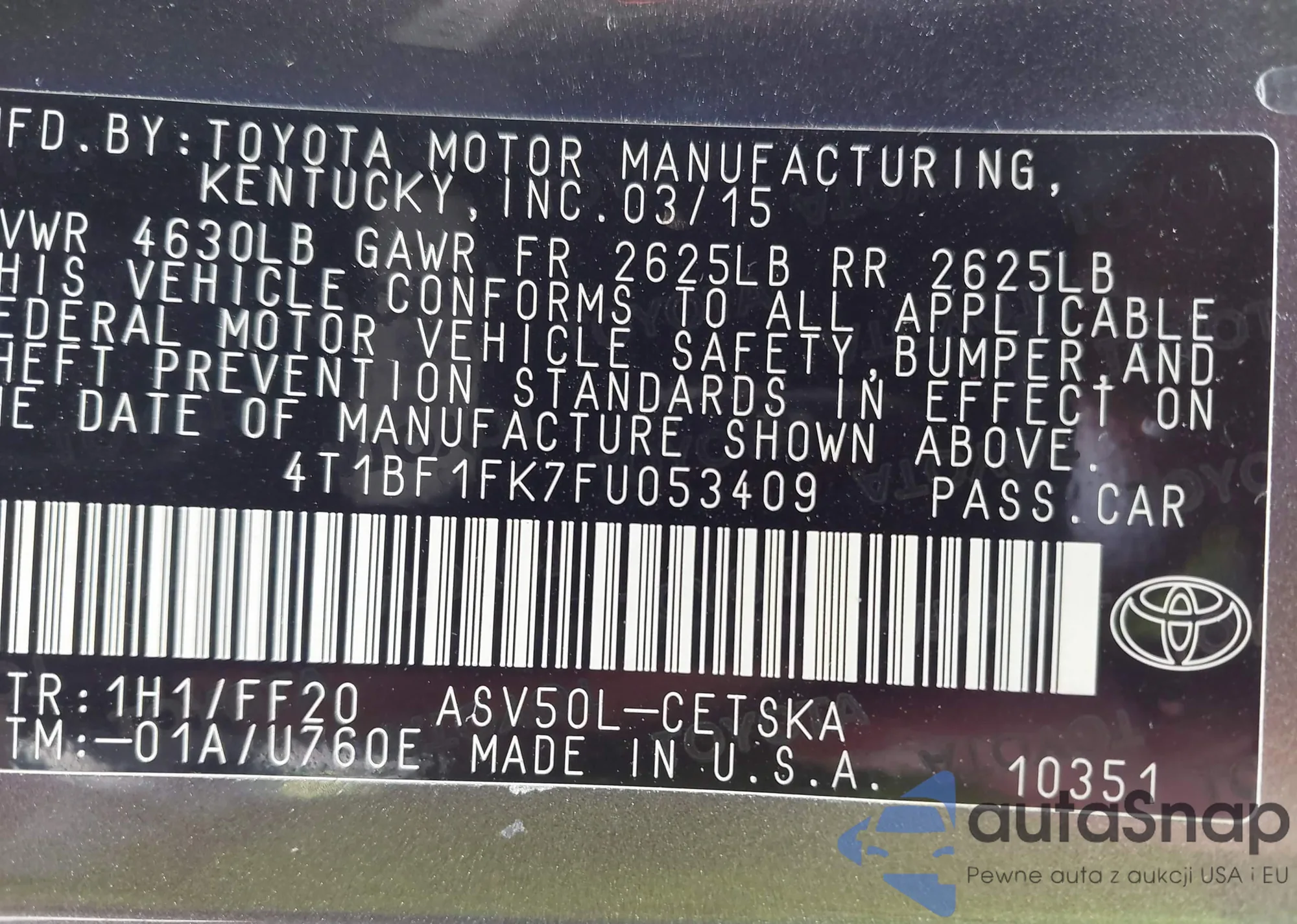 • VIN 4T1BF1FK7FU053409