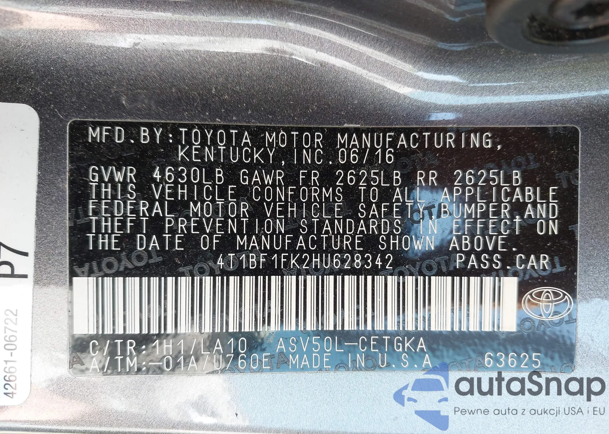 • VIN 4T1BF1FK2HU628342