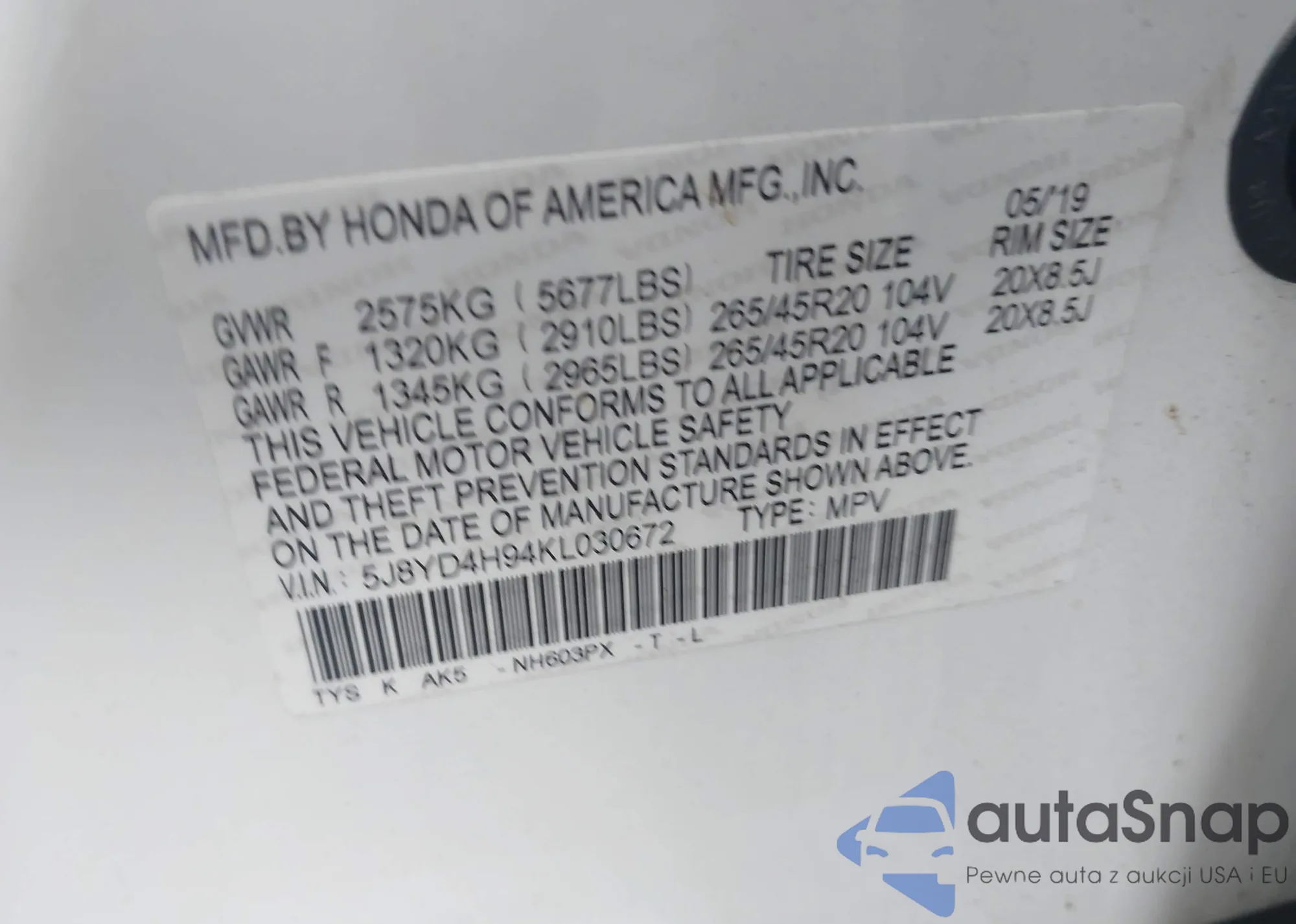 LOT: 42349991 VIN: JA4AR3AU1LU007804