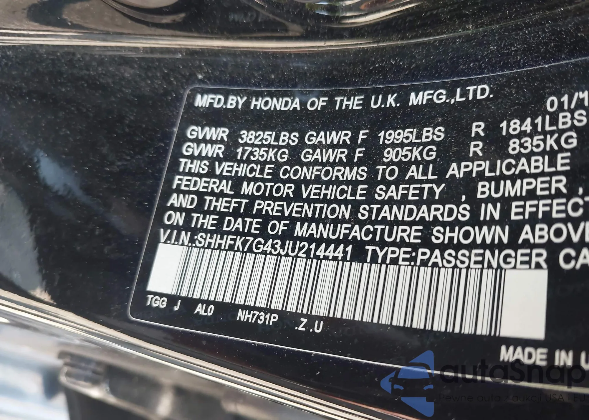 • VIN SHHFK7G43JU214441
