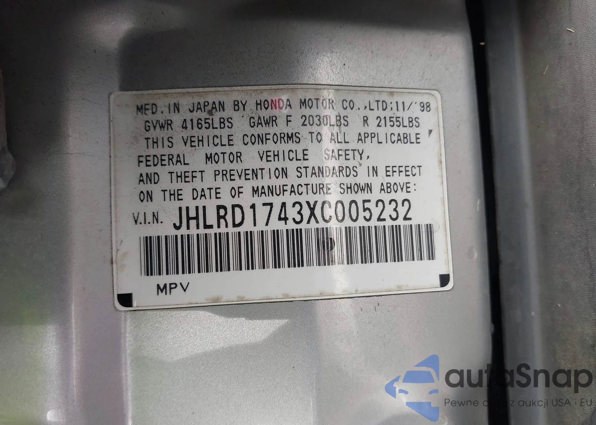 • VIN JHLRD1743XC005232