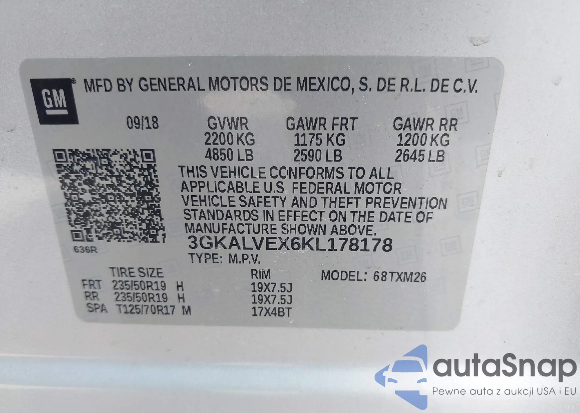 LOT: 42581796 VIN: 3GKALVEX6KL178178