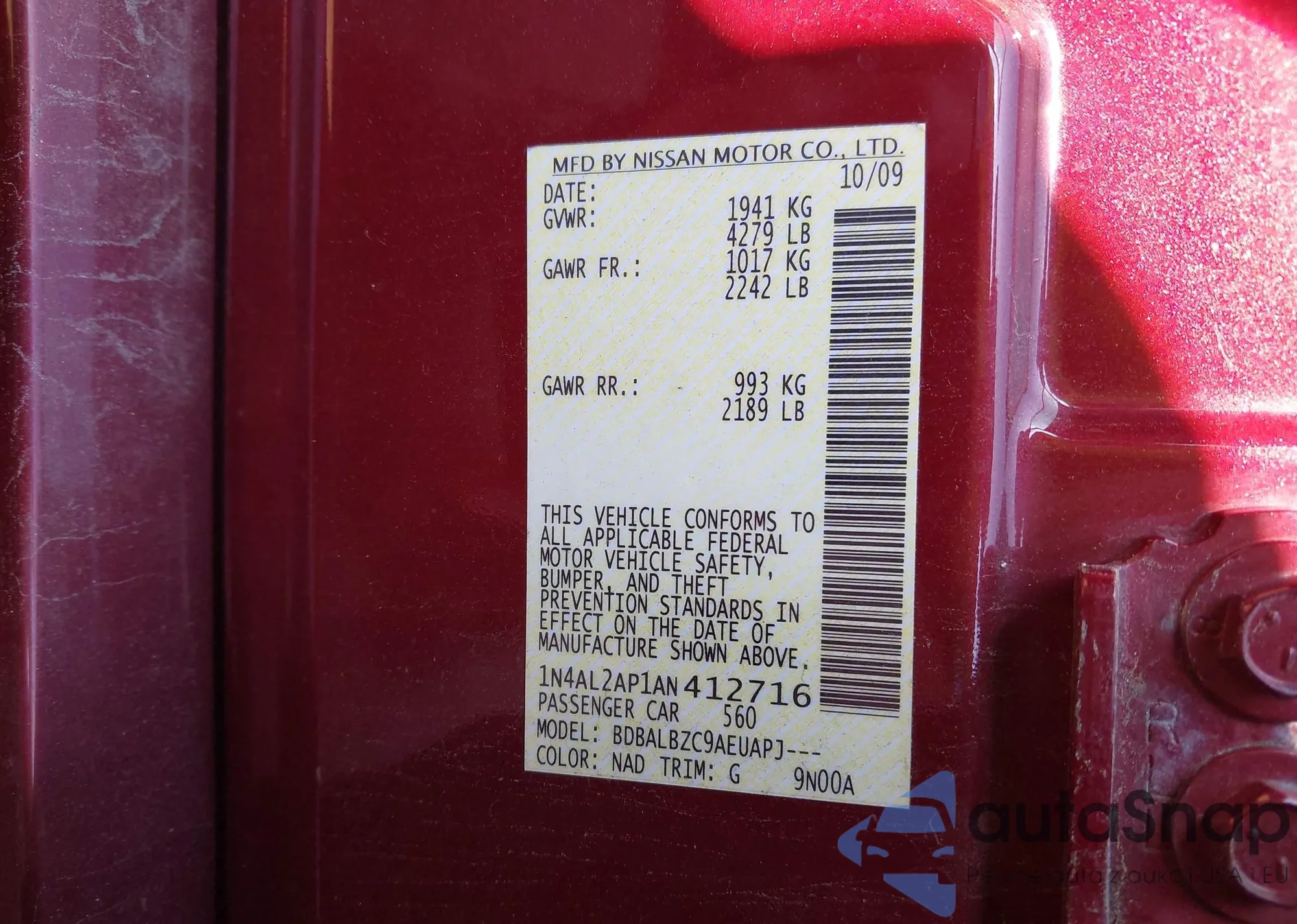 LOT: 42970857 VIN: 1N4AL2AP1AN412716