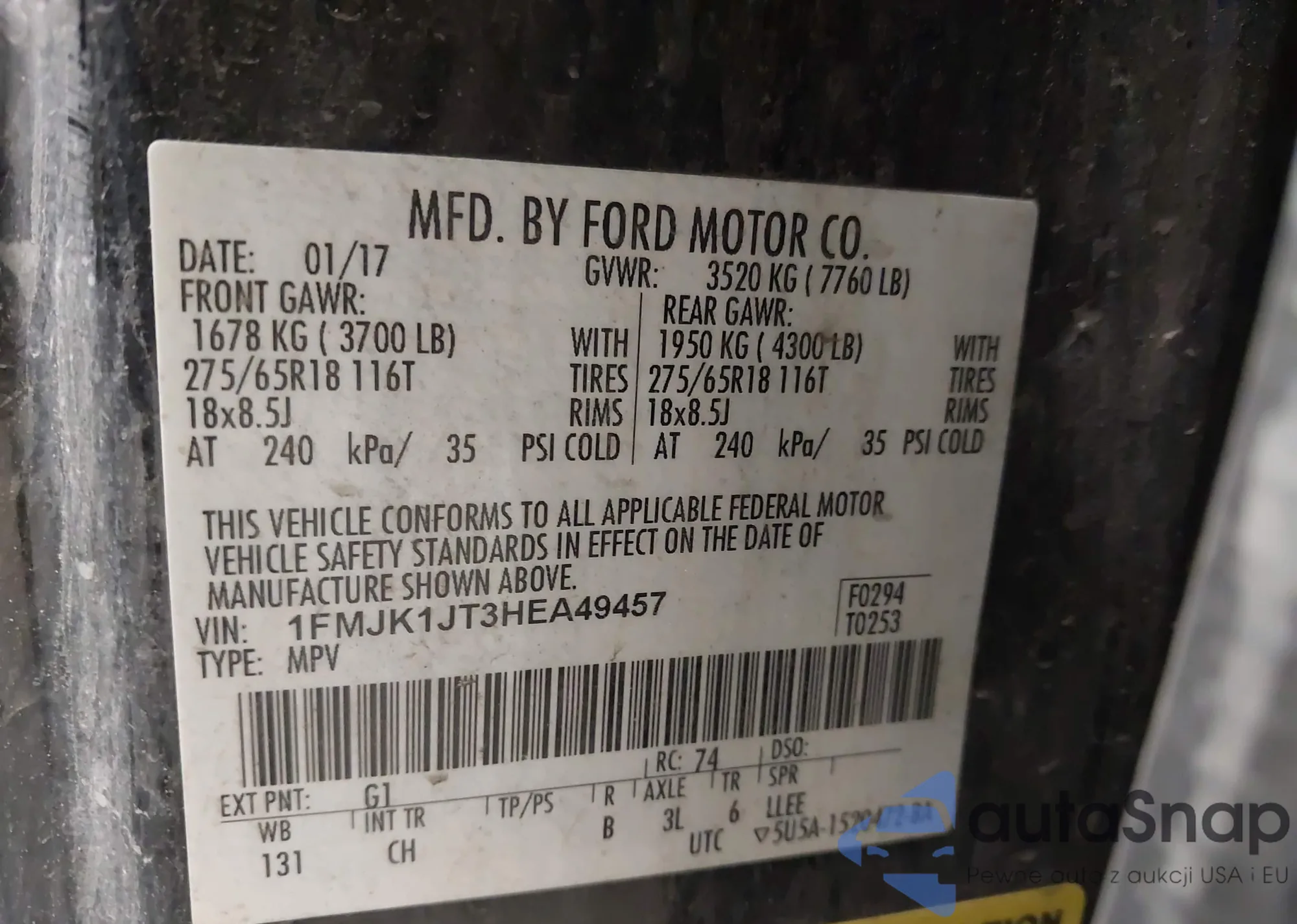 LOT: 42349608 VIN: 1FMJK1JT3HEA49457