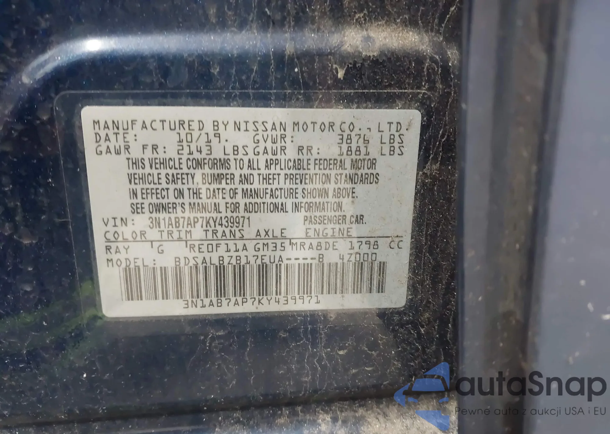LOT: 42997410 VIN: 3N1AB7AP7KY439971