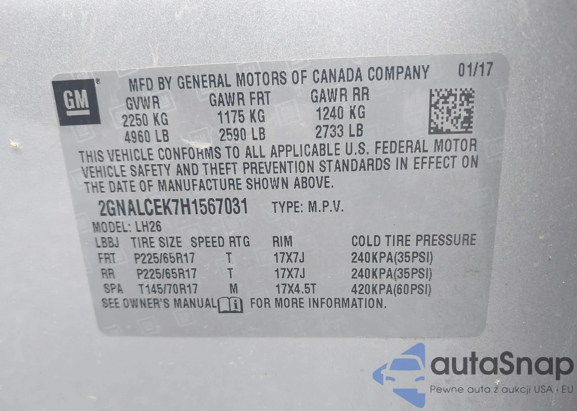 LOT: 42718354 VIN: 2GNALCEK7H1567031