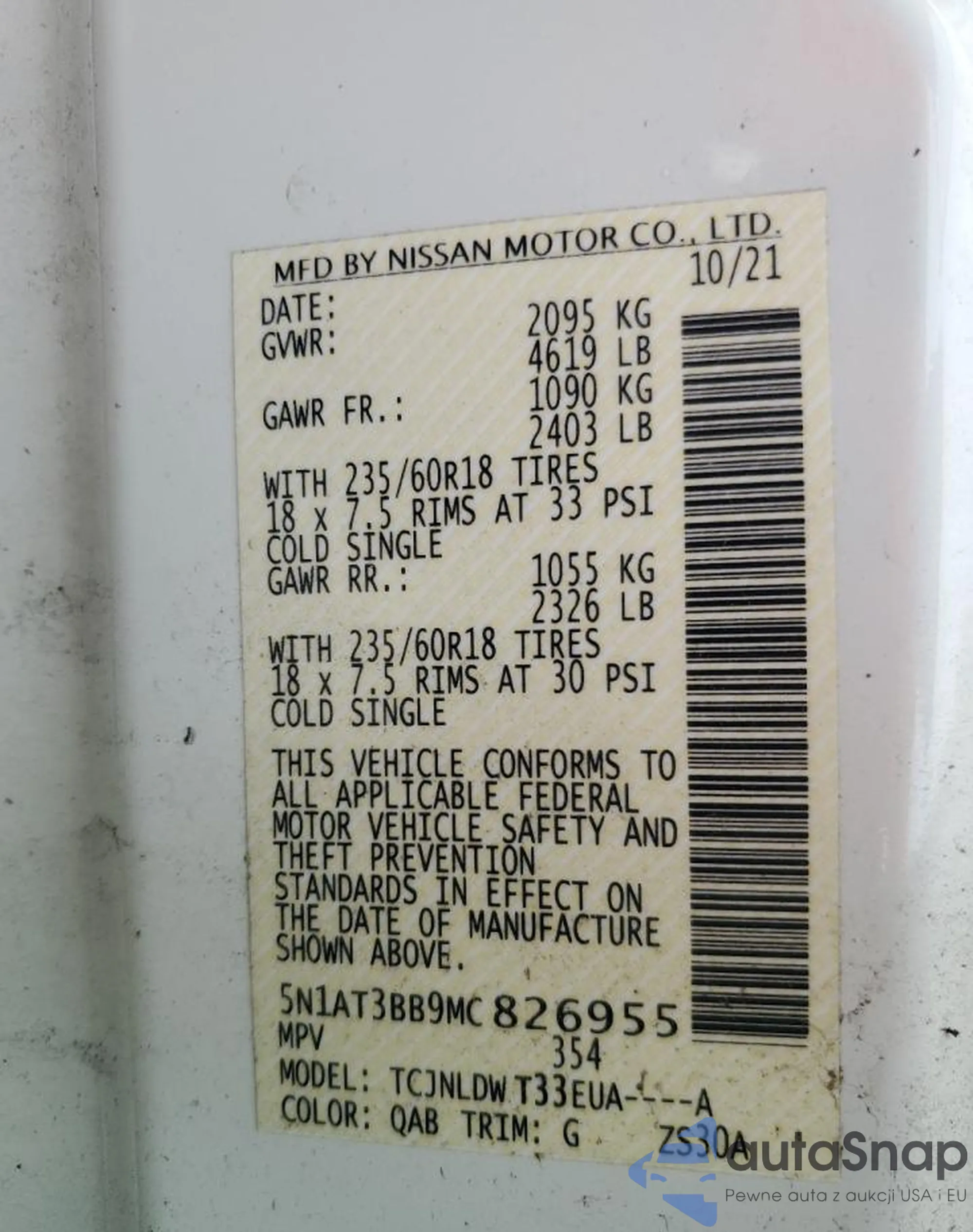 LOT: 67580805 VIN: 5N1AT3BB9MC826955