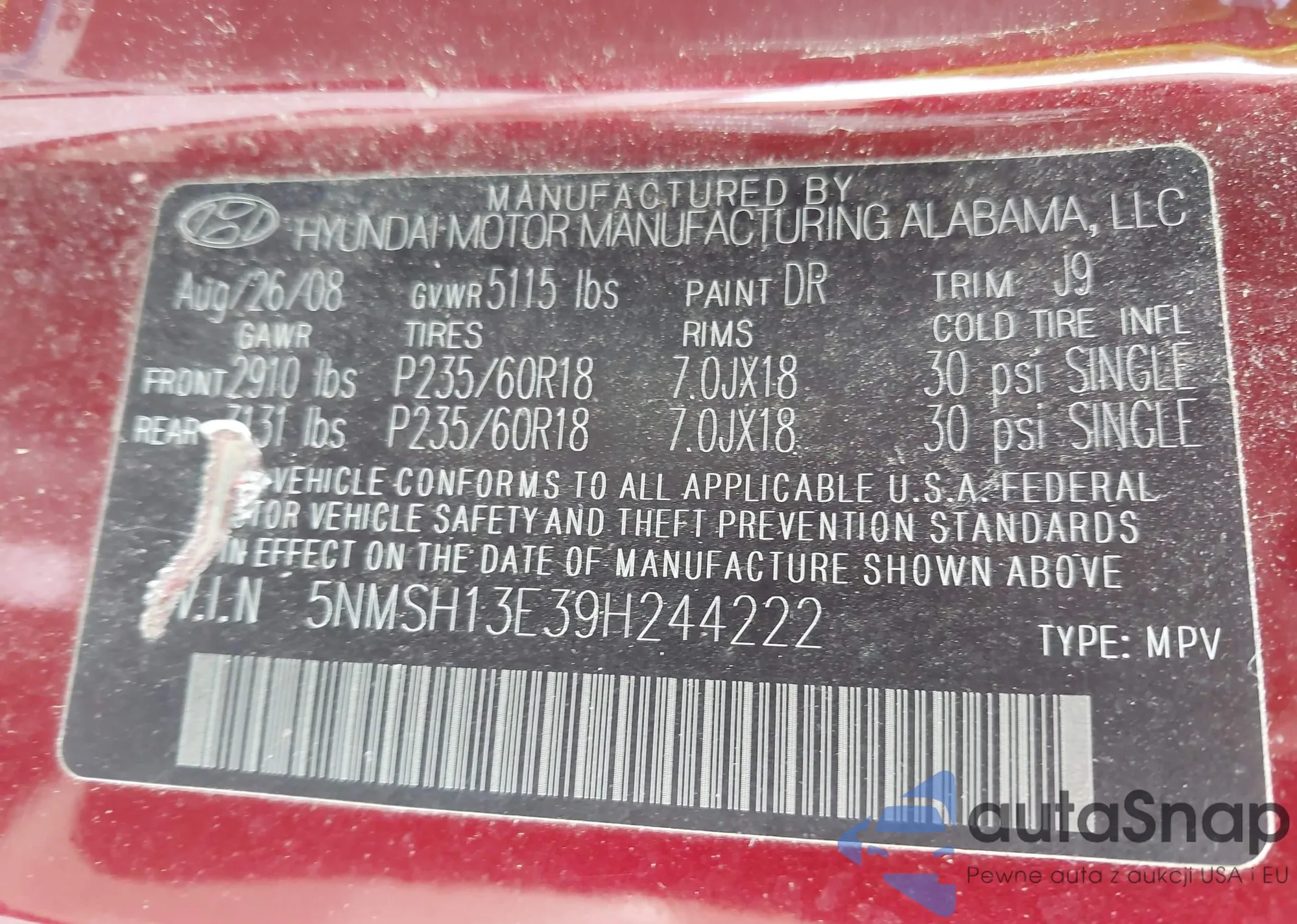 • VIN 5NMSH13E39H244222