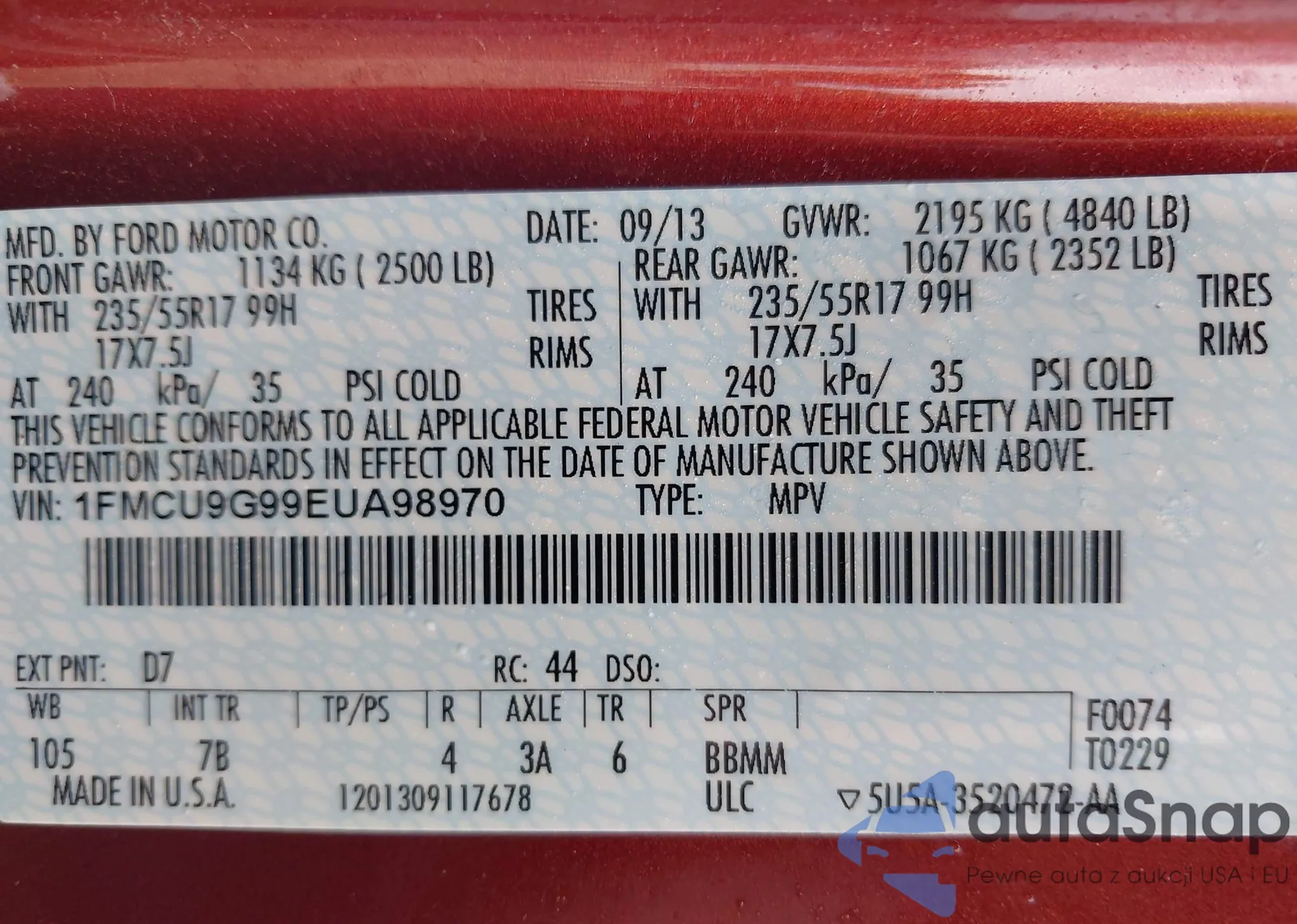 LOT: 42876466 VIN: 1FMCU9G99EUA98970