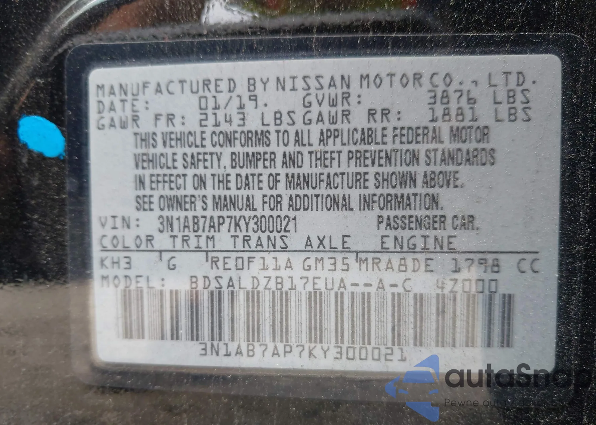• VIN 3FADP4TJ6JM141779