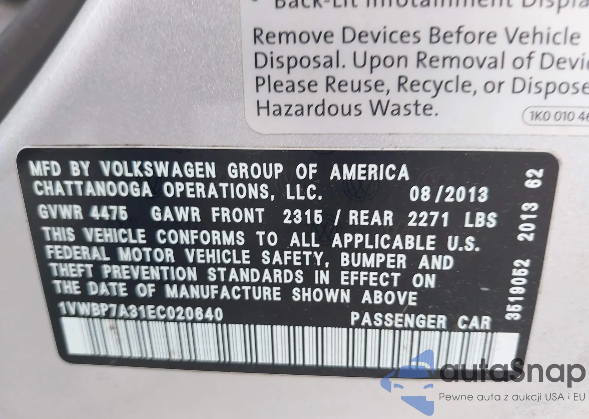• VIN 1VWBP7A31EC020640