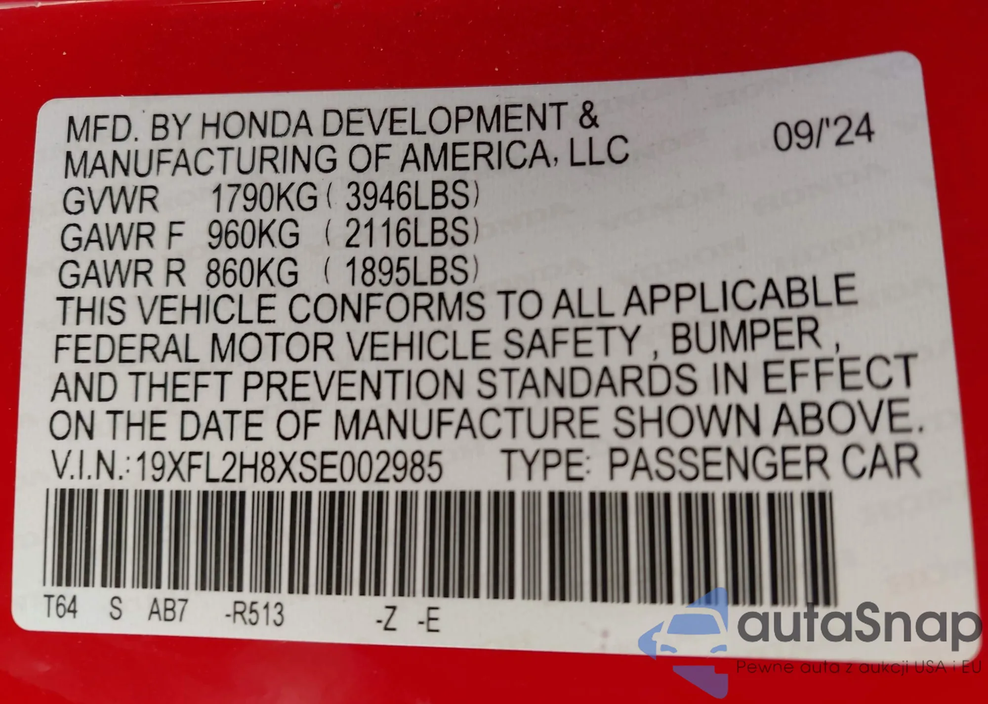 LOT: 42364474 VIN: 19XFL2H8XSE002985